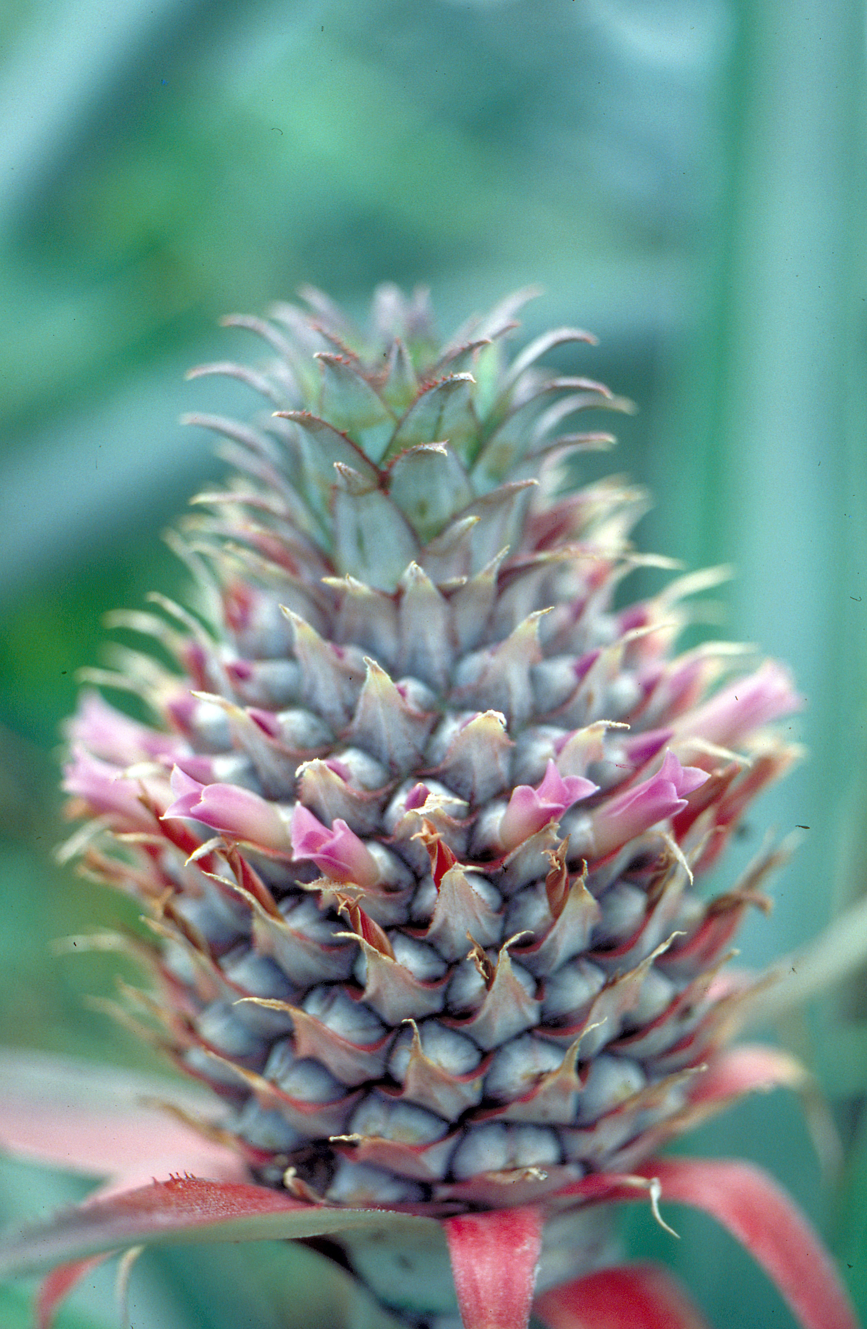 鳳梨樹高約卅至五十公分,果實是屬於「多花果」——由葉叢抽出的花序呈松球狀、密生淡紫色小花,鳳梨皮上的每一個果目就是一朵小花長成的,一個果實約有一百到一百五十朵小花。不易被我們削淨的果皮即是花腔,托住花朵的果柄則連接果實,成為棄之可惜的「鳳梨心」。