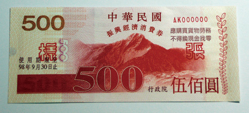 這個趕在2009年春節前發放的「紅包」,裡面將有6張500元面額、3張200元面額的消費券,並需在9月30日之前用完,希望能刺激經濟成長率增加0.64個百分點。