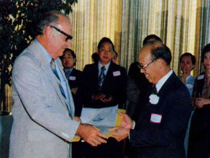 在中國商銀休士頓代表辦事處開幕酒會中,休士頓市議員 Frank Mancuso(左)代表該市市長頒贈魏董事長榮譽市民證書。(恆水)