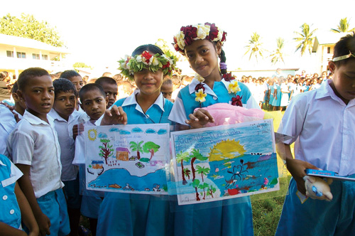 首先,他們在吐國首都富納富堤的兩所小學,先以「彩繪家園」為主題舉辦郵票設計繪畫比賽,順勢介紹世界地球日的緣起。