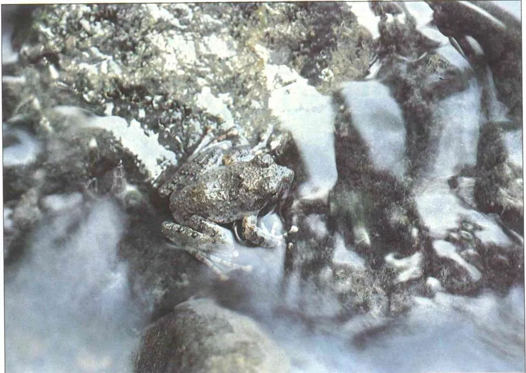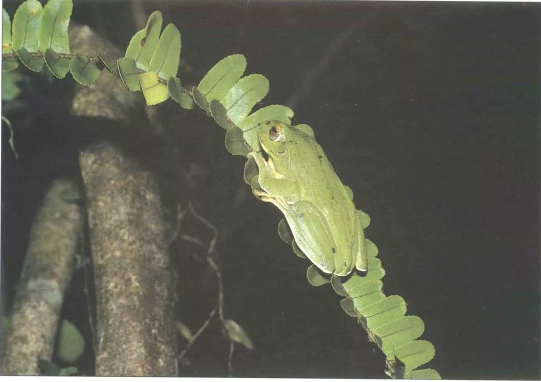 不同種類的蛙,生活在不同的棲地裡,它們各擁有與棲地融合的保護色。有的蛙甚至可以「入境問色」,隨棲地的改變而變換它的體色。圖為台北樹蛙。台北樹蛙。