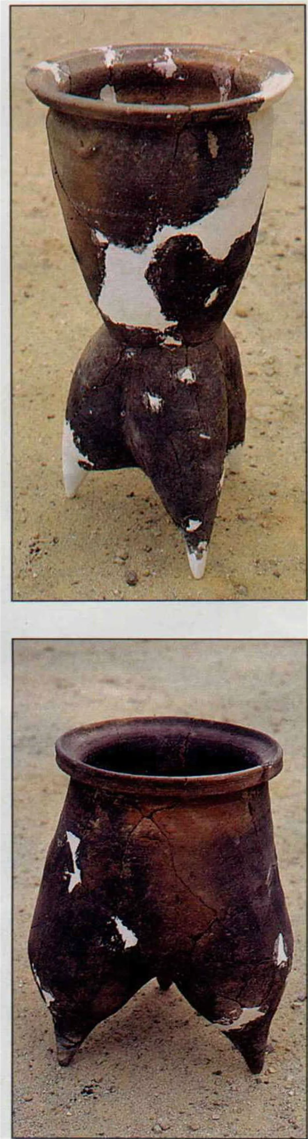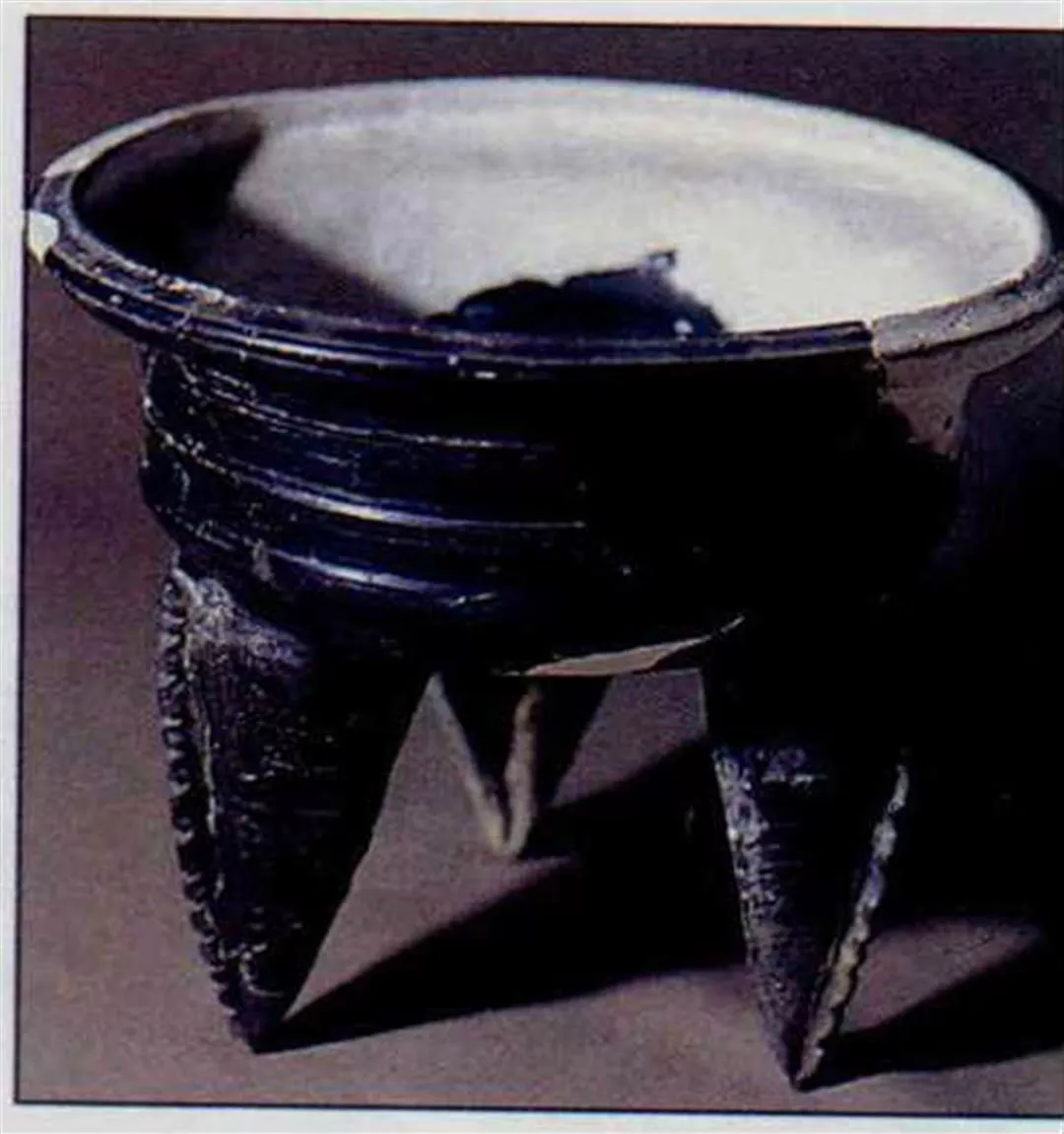 (左)經過復原的黑陶鼎,足部作鳥嘴狀,俗稱「鬼臉足」,可推源於原始人的鳥獸崇拜。