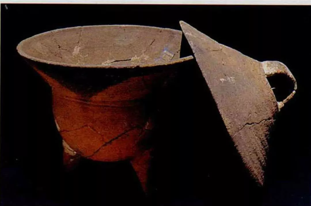 (右)山東莒縣陵陽河遺址出土的褐陶鼎,年代距今五千年左右,器蓋上還有個把。