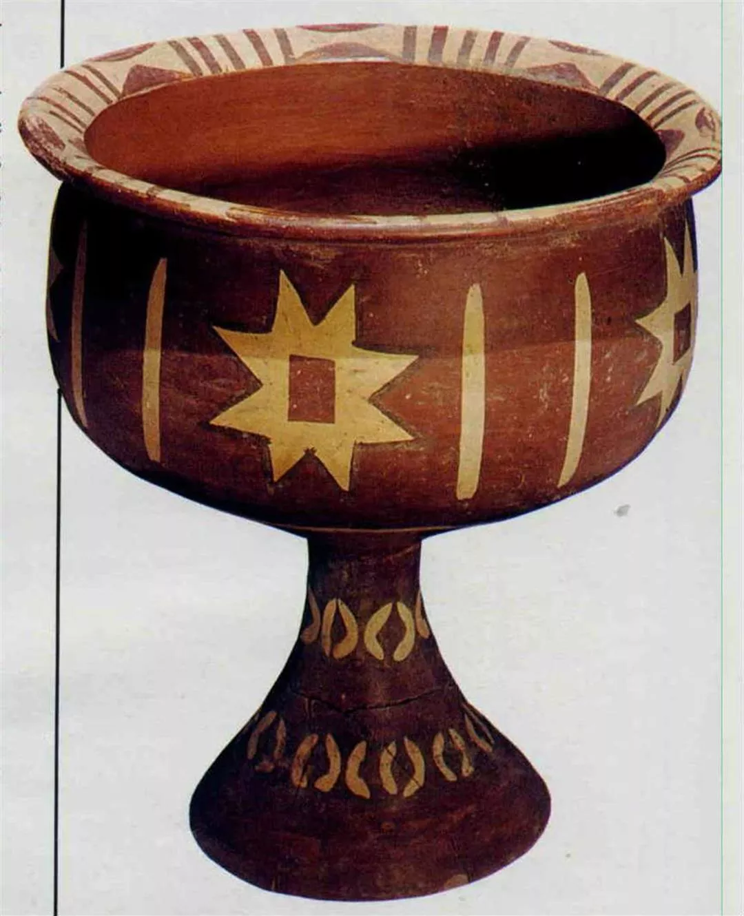 龍山文化前期也出現彩陶,這是大汶口出土的彩繪陶豆,非常不同的形制。(張良綱)