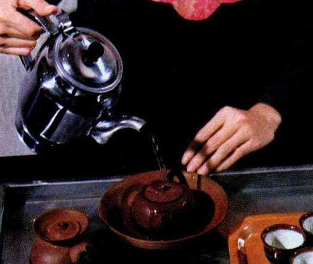 然後第二次注水,進行第二泡,大約浸泡四十五秒,提起茶壺,以拇指和中指握壺把,食指按在壺蓋上,順沿茶池邊緣繞兩周,以滴淨壺底的水,這個步驟,俗稱為「關公巡城」。然後再以巡迴方式注入裝滿每個小茶杯,但不可待裝滿第一杯,再裝第二杯,以免各杯茶味濃淡不一,這個巡迴注茶的步驟,俗稱「韓信點兵」。