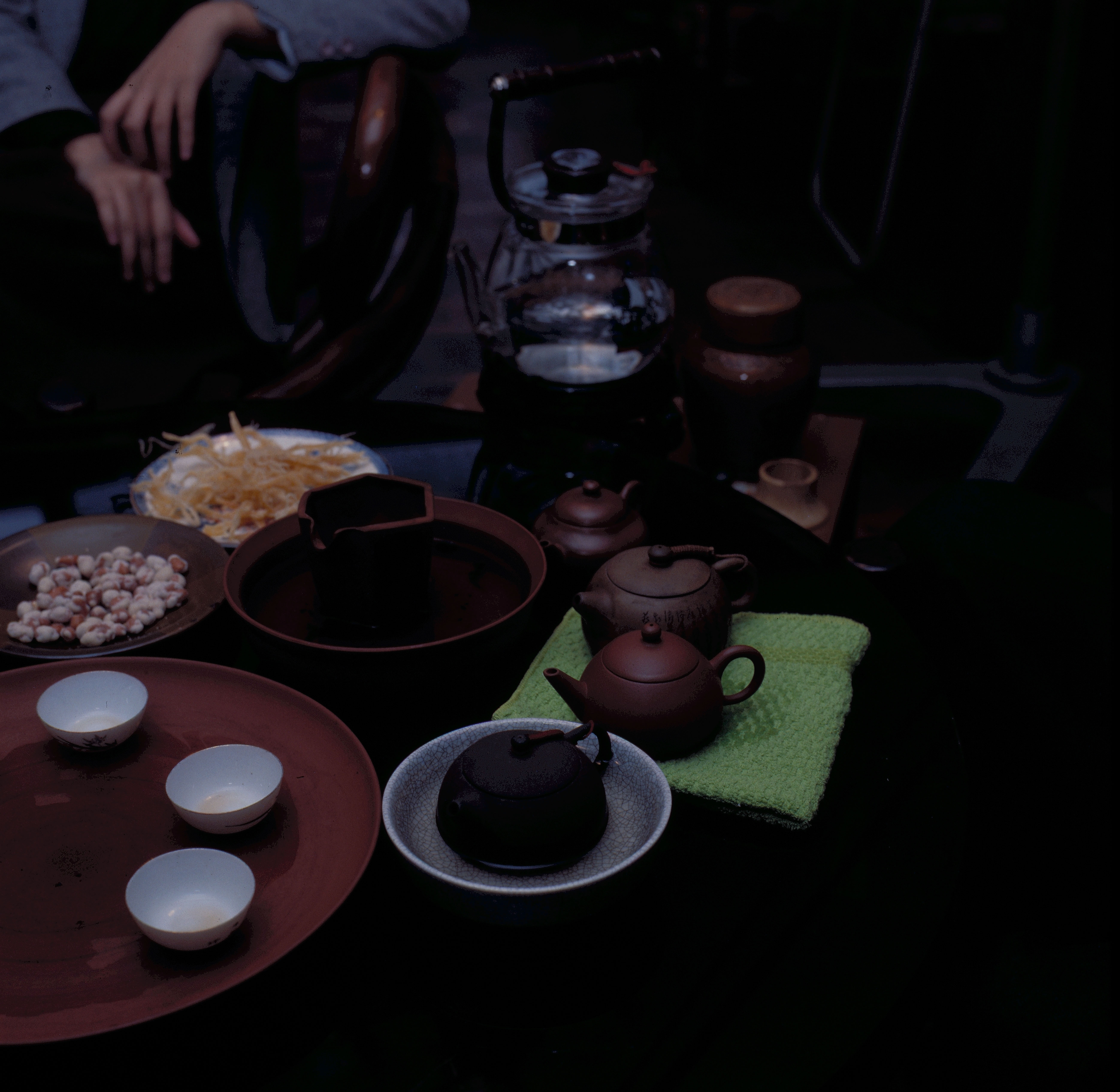 主要的茶具——壺、盅、杯、池,和茶食——碗豆、魷魚絲。(魏嬡)