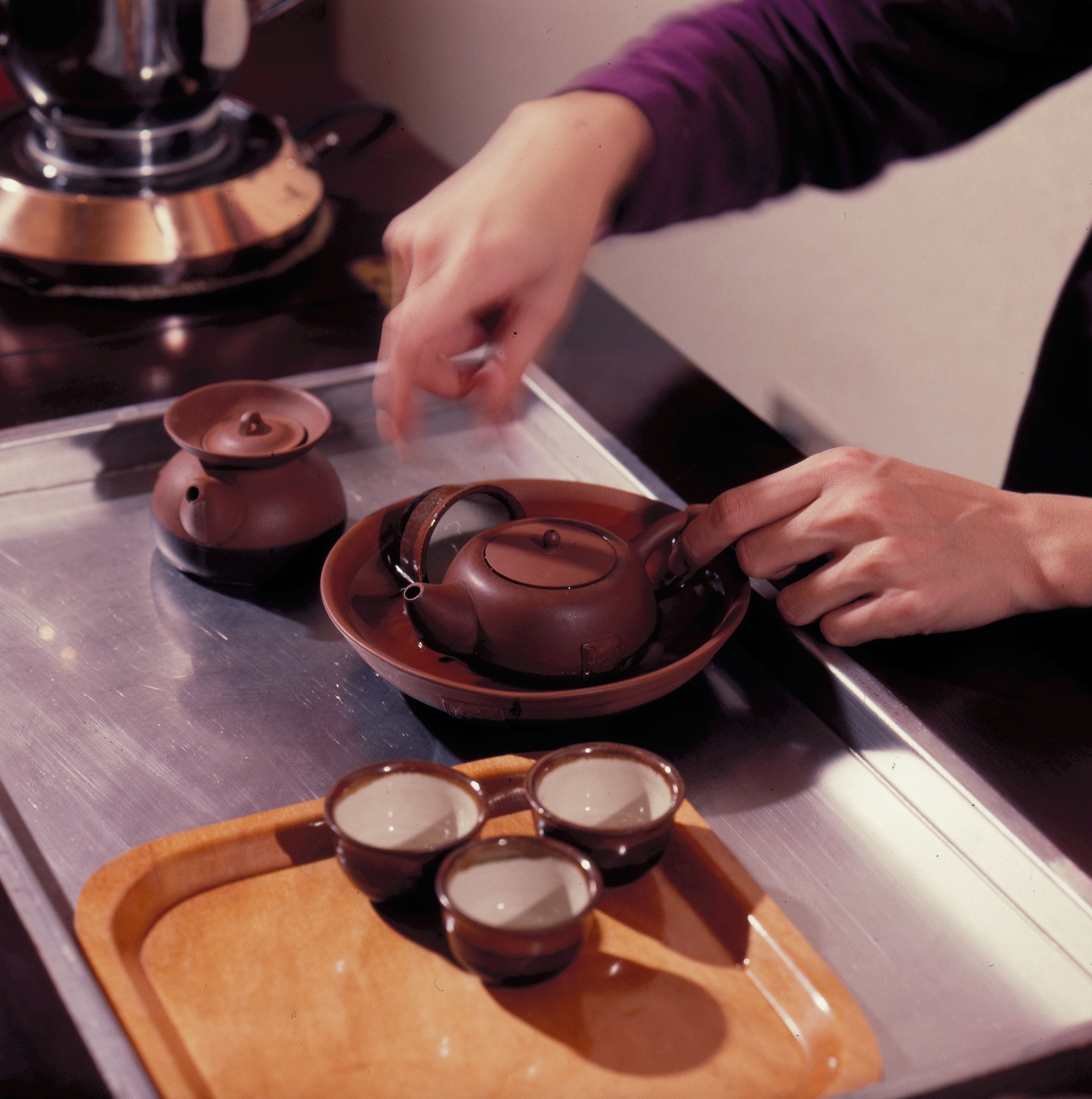 室內燈光柔和,絲竹之聲清越悠揚,壁上懸掛著國畫,桌旁有雕刻擺設,顯得古色古香。一桌桌客人,有的低聲交談,洽商公事;也有好友相聚,聊得興起;更有雙雙對對的情侶,正低頭喁喁談心。這大概是家「中國味」較濃的咖啡館吧?再仔細一瞧,每張桌上都擺著一壺茶,茶旁有個小電壺可自行添水,室內還飄著縷縷茶香呢!原來這是家「茶藝館」!這是目前自由中國台灣,許多人約會、談事情喜歡去的地方。