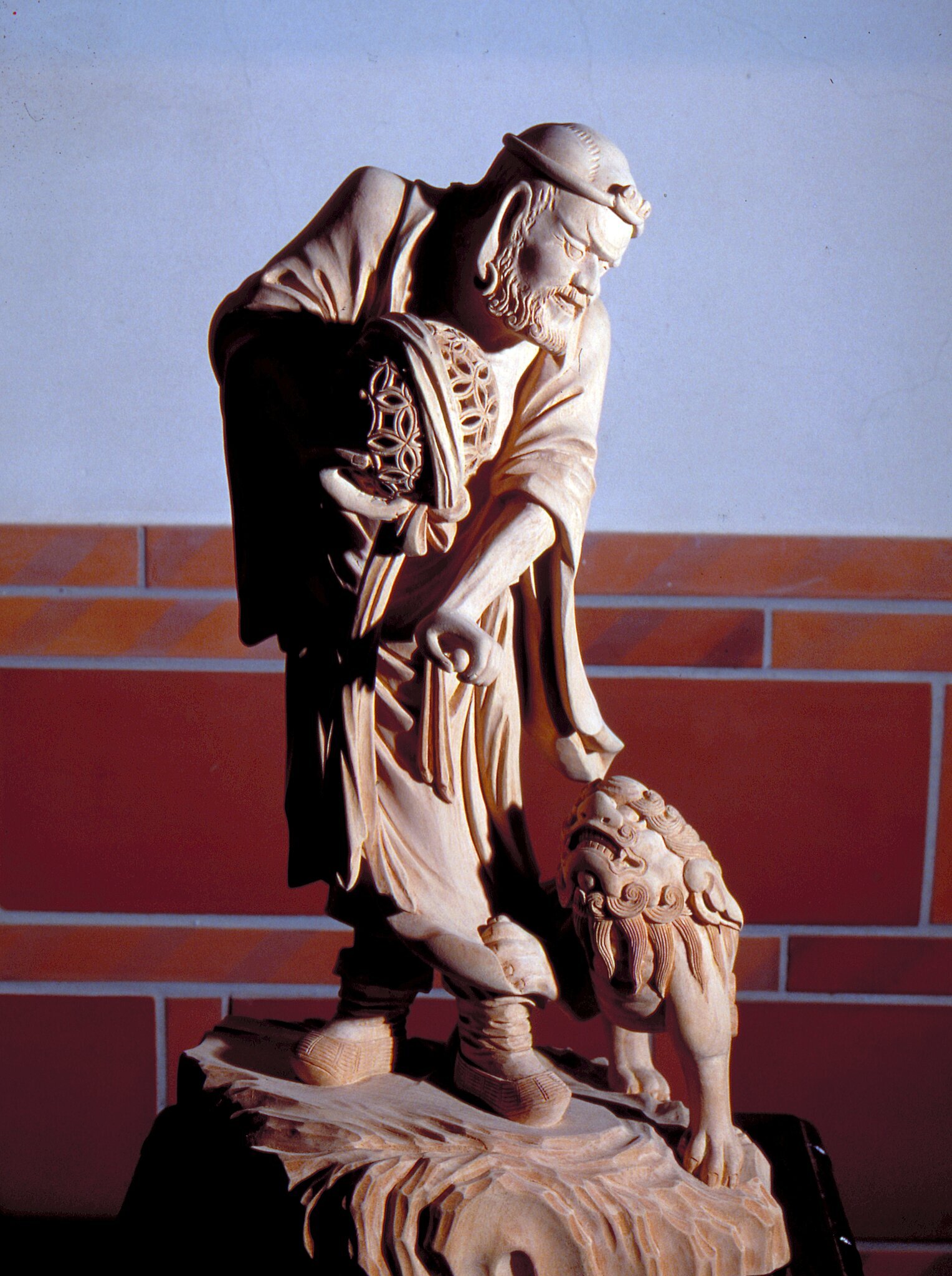 李松林認為佛像的精神可由作者發揮,但造型應遵照傳統。上圖是他刻的伏獅羅漢。(張良綱)