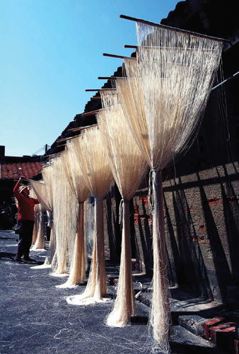 長長久久的手工麵線 文‧紀國章 圖‧紀國章 2006 1月 EN 分享: 細細長長的麵線,印象中總是跟延壽、好運相連。 彰化縣福興鄉由於海風頑強、日曬充足,製作出來的麵線特別好吃,不僅富有彈性而且不易斷裂。當年風光時,從事麵線行業的人家曾經高達三十多家。 今天,福興鄉仍然可見幾戶手工麵線人家,他們秉持傳統,做工紮實,堅持用雙手作出別具風味的手工麵線。 分享: