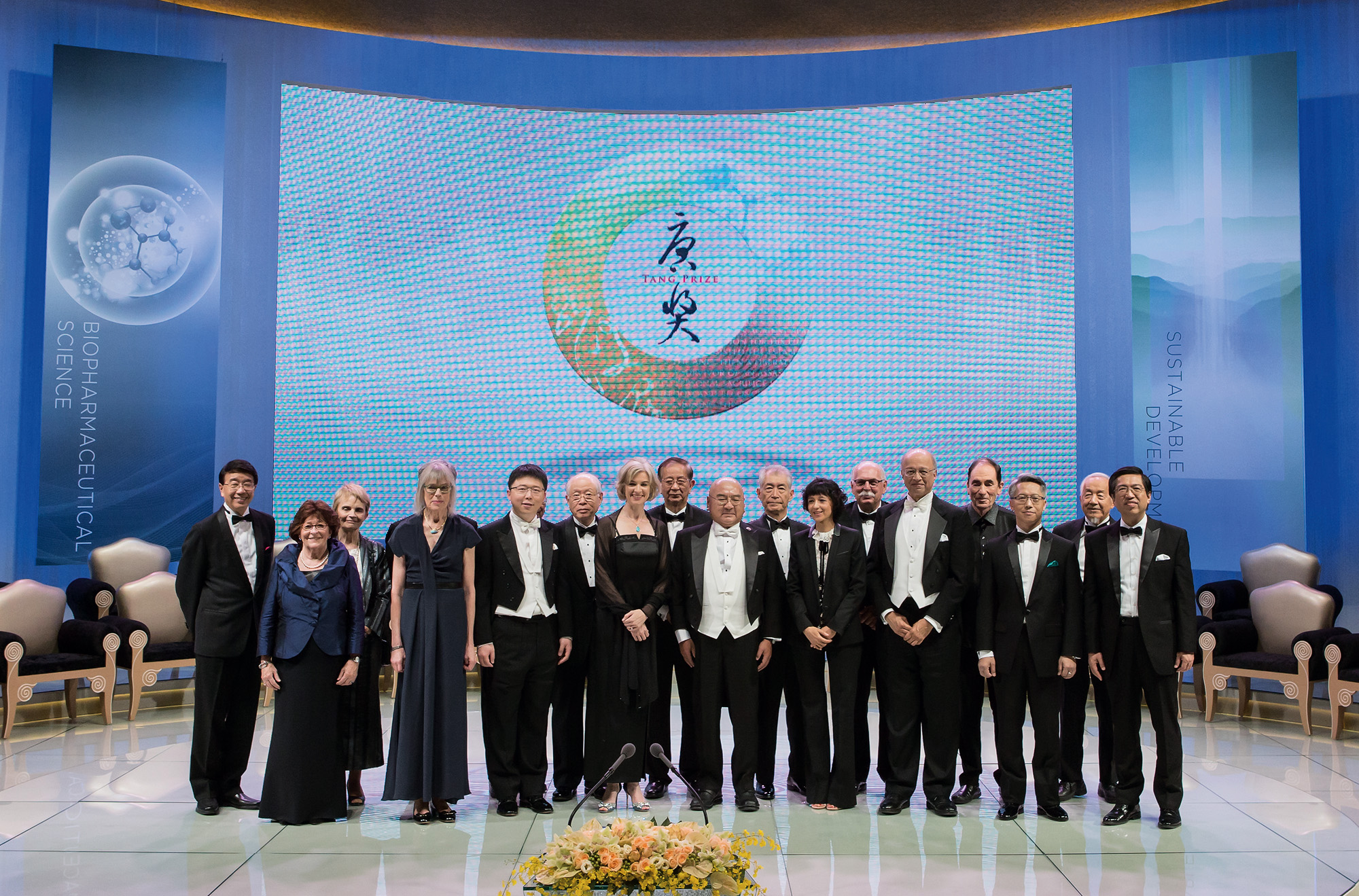 由企業家尹衍樑(中)所創辦的唐獎,第二屆頒獎典禮在國父紀念館舉辦。「永續發展」、「漢學」、「生技醫藥」與「法治」獎項六位獲獎者及代表人台上合影。