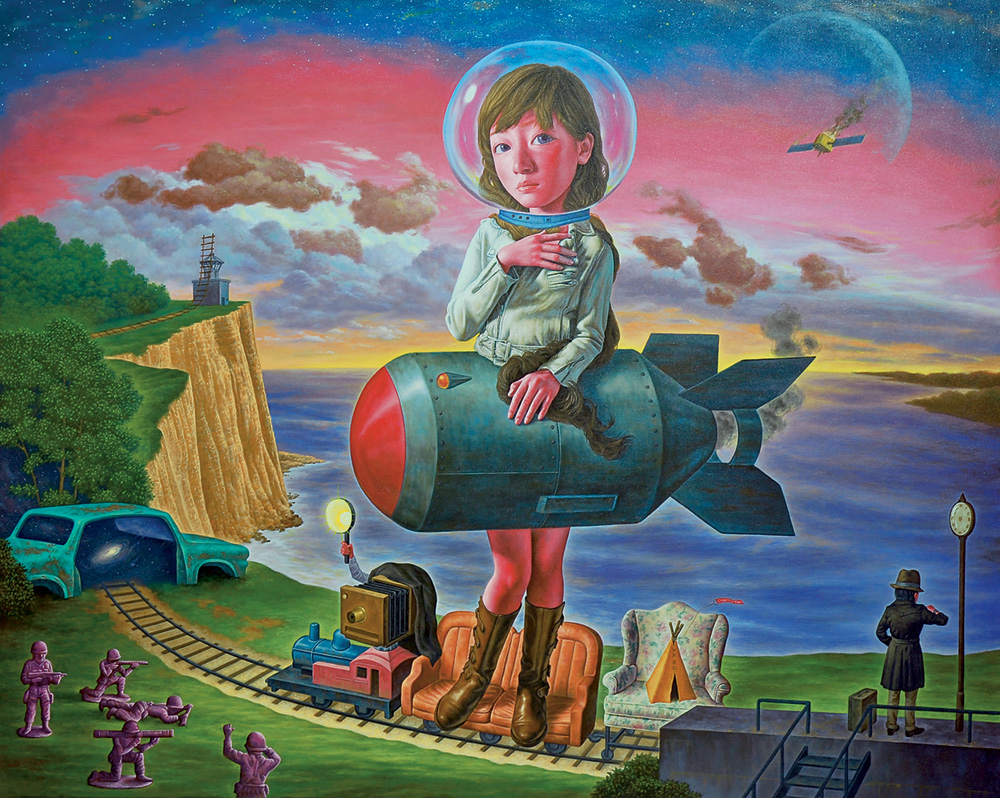 「少遊島繪社」成員、藝術家詹喻帆的畫作《維納斯二》。穿著皮衣和砲彈的現代維納斯,象徵堅強的女性,抵禦小兵的襲擊。