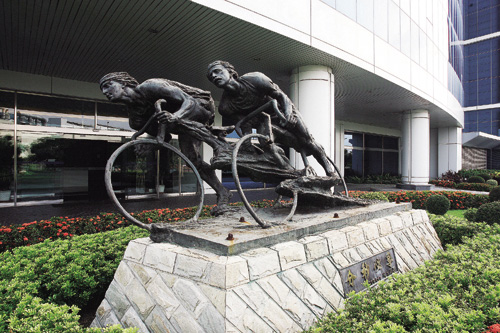 (左)奇美電子總部大門前的雙人騎單車雕像,象徵奮力向前、永不懈怠的精神。(林格立攝)(下)臨危受命的王志超,以短短7年年資跳升總經理,各界均寄予厚望。