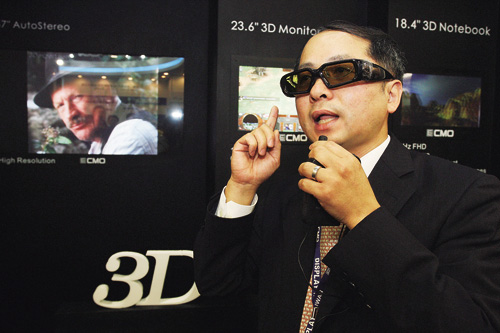 2年前開始量產,如今奇美電已是全球3D液晶面板最大供應商。圖為業務副總郭振隆在今年光電展中,向媒體解說榮獲2009台灣精品獎的23.6吋16:9的120Hz 3D 技術螢幕。