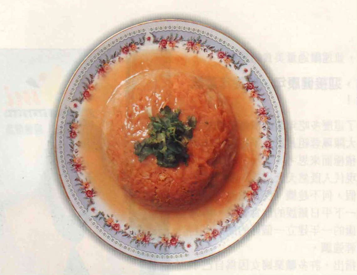 6.蒸好後,將大碗倒扣至盤中(干貝在最上面),湯汁則倒回鍋內,略加勾芡後淋下即可