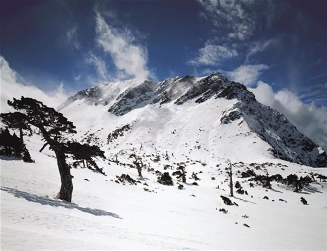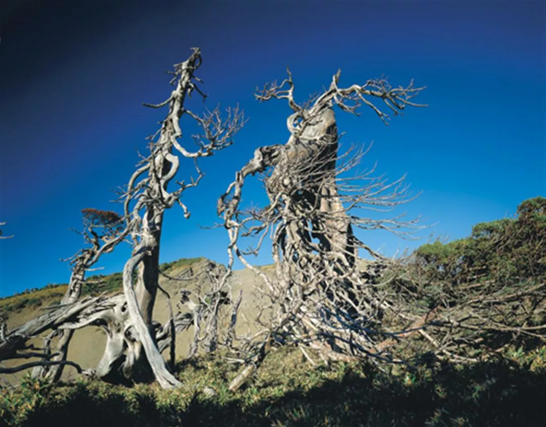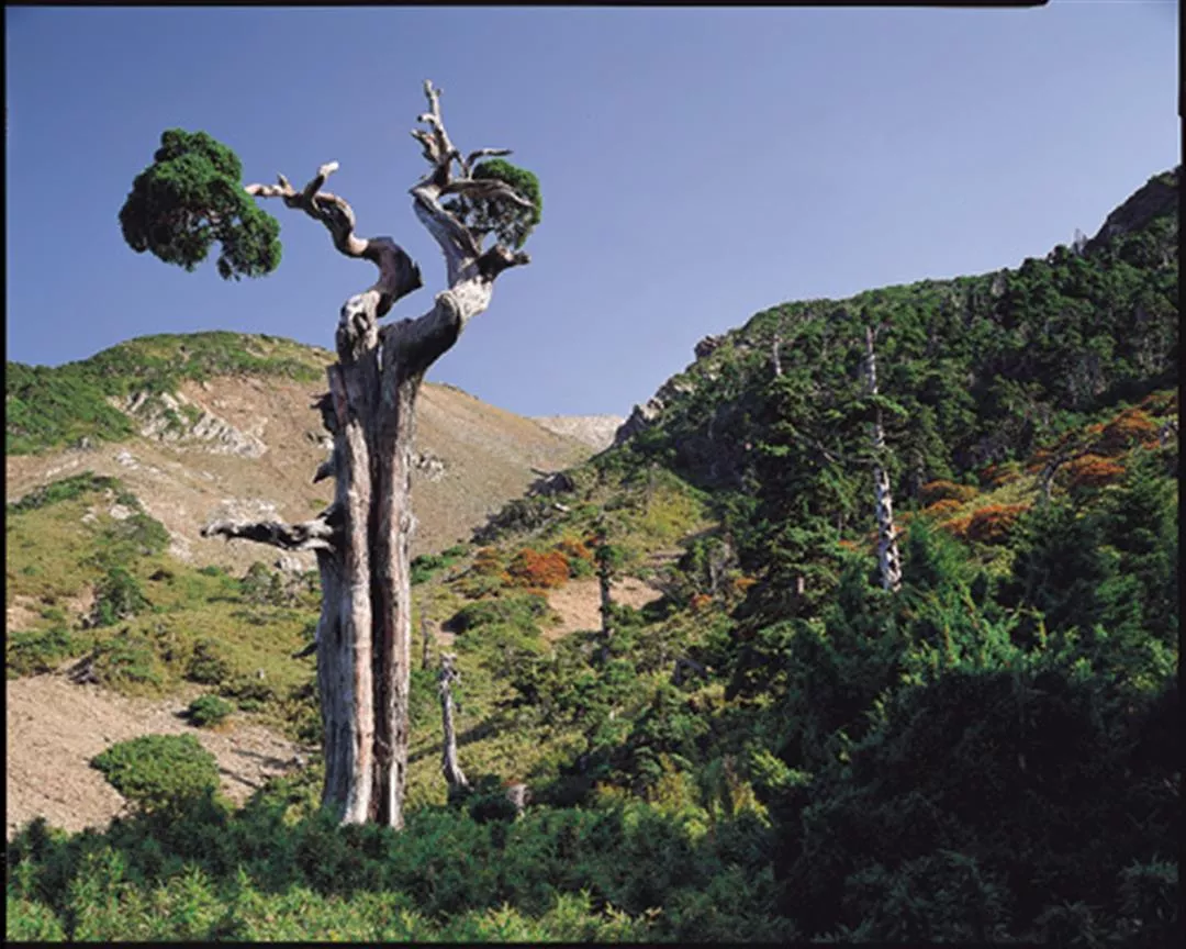 玉山圓柏受到強風吹襲、大雪積壓、雷打雨淋等大自然的嚴酷鞭笞後,呈現出桀傲不馴的生命力,在山巔上吐吶不凡的氣息。(拍攝地點南湖東北峰)
