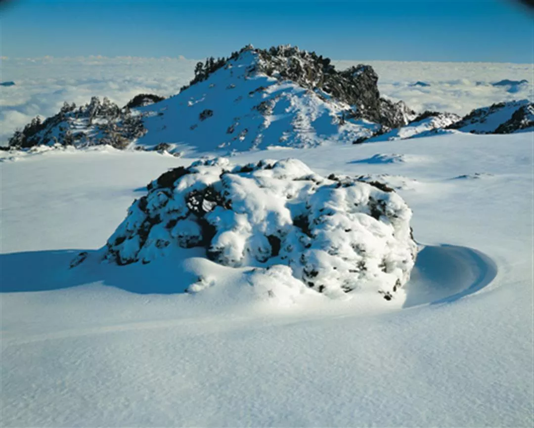 玉山杜鵑受到風雪的洗禮後,形成狀似冰淇淋的造型,為視覺增添審美樂趣,搭襯遠處壯闊雲海,讓這場大自然的清涼饗宴更顯氣派。(拍攝地點南湖主峰鞍部)