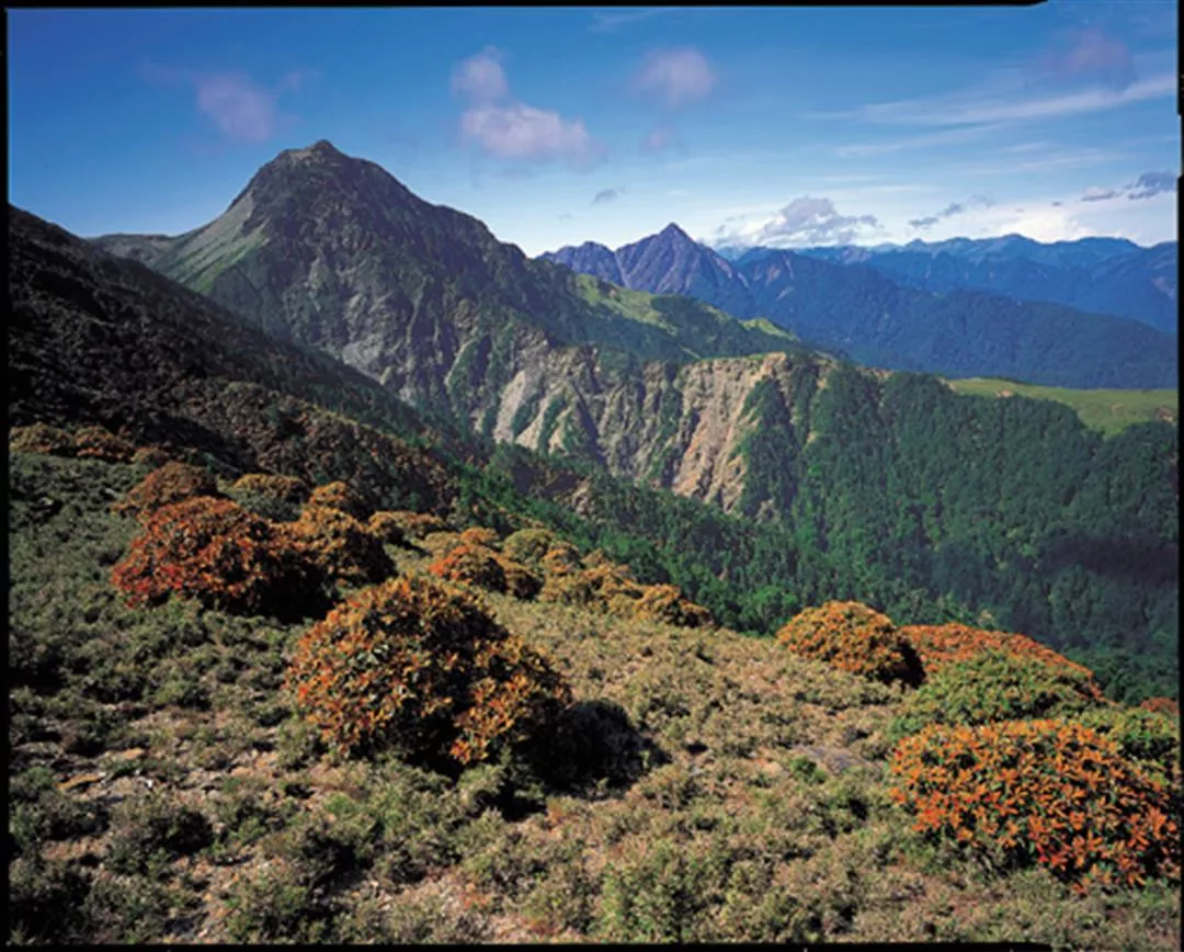 此圖為中央銀行所發行面額兩千元紙鈔的南湖大山圖像;從審馬陣草原遠眺南湖主峰,遠處右方為中央尖山,兩山交會的山谷,為中央尖溪的源頭,是國寶魚櫻花鉤吻鮭的原鄉。
