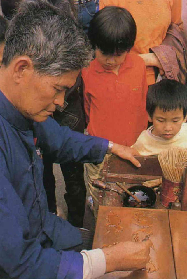 畫糖師傅熟練地將糖漿倒在銅板上,一幅幅靈躍活現的圖案就已粗具。(鄭元慶)