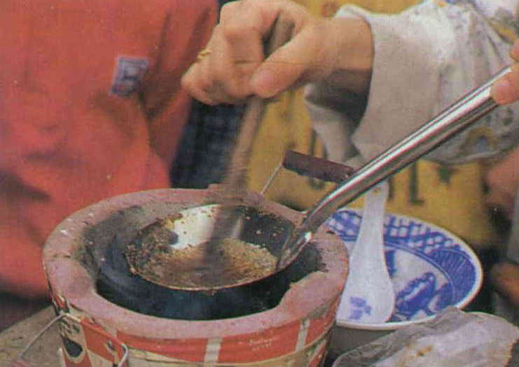 首先,將麵粉以溫火翻炒至略焦黃,也可加點細紅蔥塊和炒至熟,並拌以細糖、芝麻,吃時再沖熱開水,攪成半糊狀即可食用。