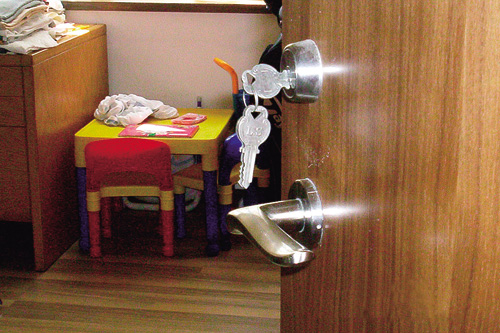 「這是通往我睡房的門。注意到插在門鎖上的鑰匙嗎?一直是掛在那裡的。我沒有拿走鑰匙的權利,這也代表我其實是沒有隱私的。任何人想進來我房間都可以隨時開門進來,甚至當我熟睡時。」