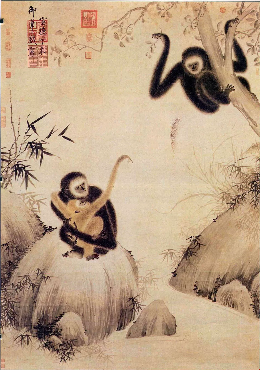 猴性母慈子孝,也是中國國畫中常見的題材。圖為明朝宣宗皇帝所繪的「戲猿圖」。(國立故宮博物院提供)