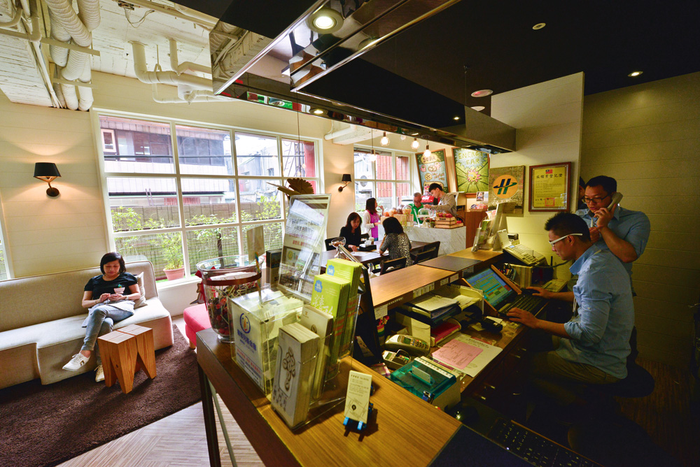 平價旅店麻雀雖小,五臟俱全,圖為位於西門町的丰居旅店,入口大廳就兼具接待櫃臺、交誼、休憩、自助輕食吧等多重功能。