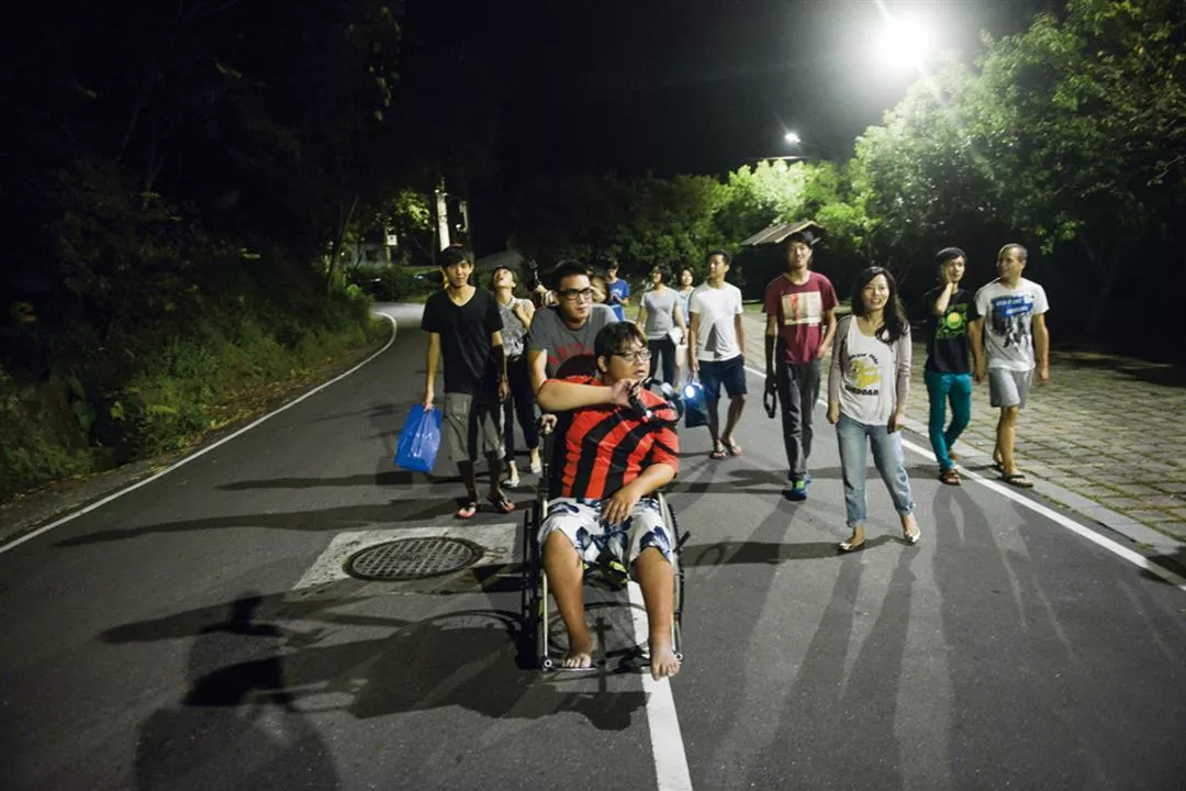 坐著輪椅的胡庭碩,親自帶著工作坊學員在坪林鄉間進行夜間導覽,讓人口老化的鄉間充滿活力。