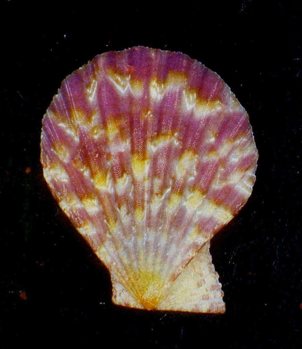 藍子樵較偏愛海扇蛤,因為它的形狀特別,像一把扇子,花紋細緻而富於變化。「海扇蛤是一種很奇妙的蛤類,像這隻日月蛤,由於它平躺海底,向上的這面是紅褐色,向下的則是白色。」他收集一百五十多種海扇蛤,最大一隻有十九公分長,可以說是貝類收藏家手中最大的一隻。