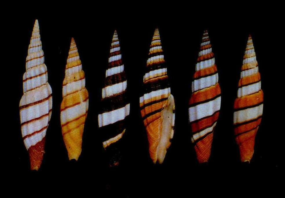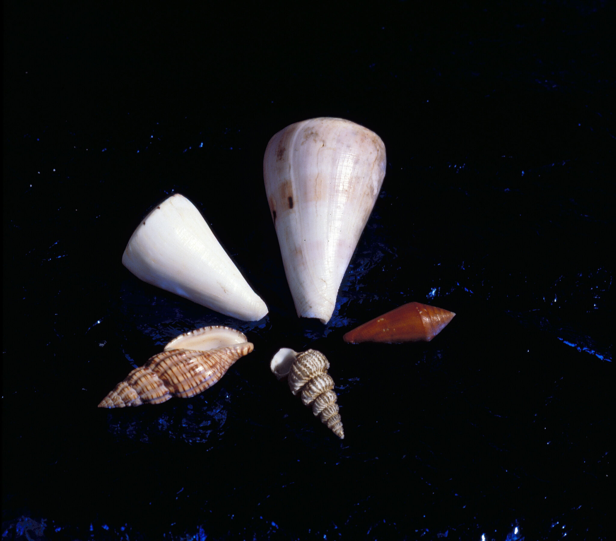 經由藍子樵新發現而命名的五種貝殼,從右上方開始依順時鐘方向為:牙雕海獅螺、台灣渦螺、菲僑芋螺、大中華芋螺,和藍氏芋螺。(楊永山)