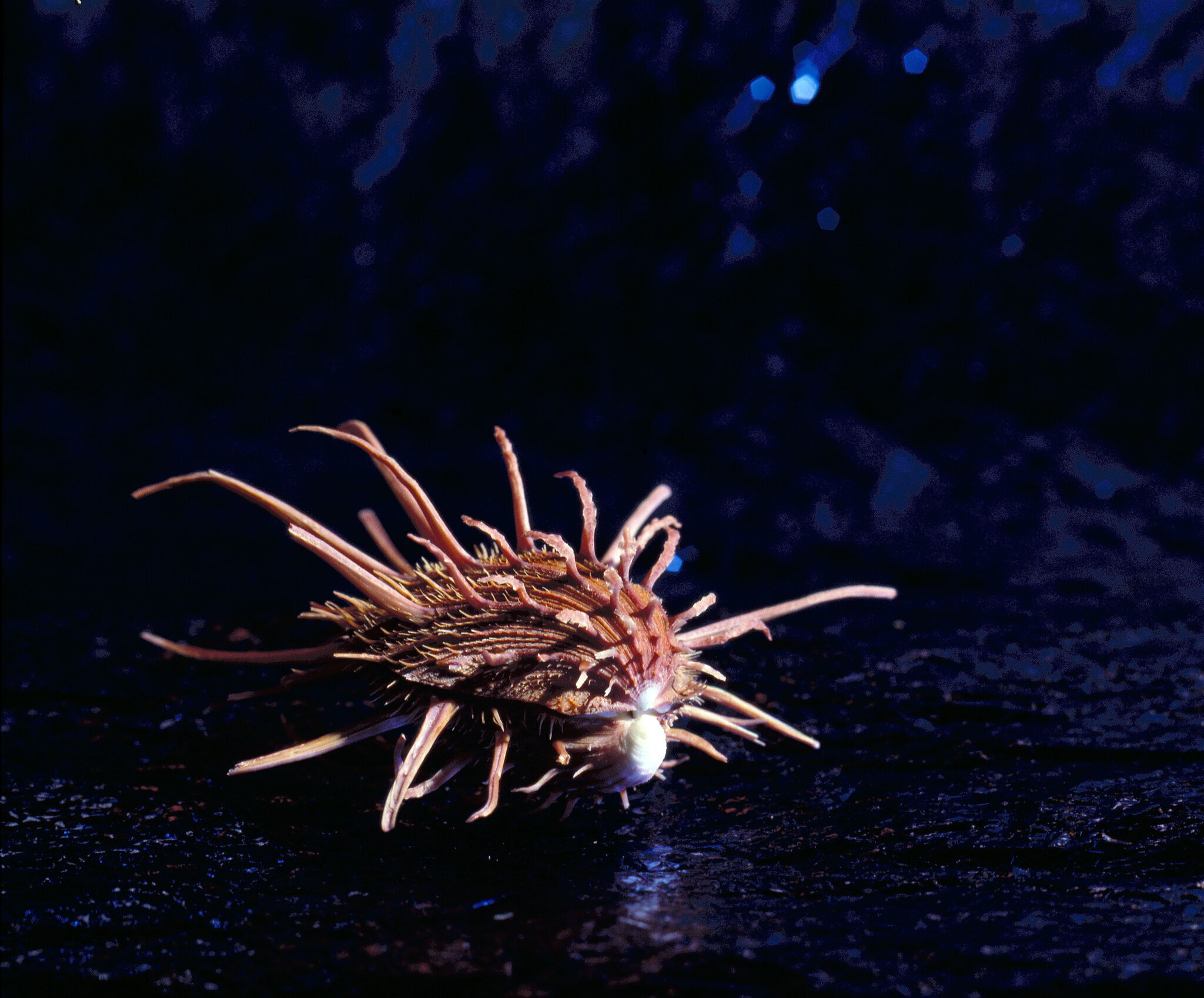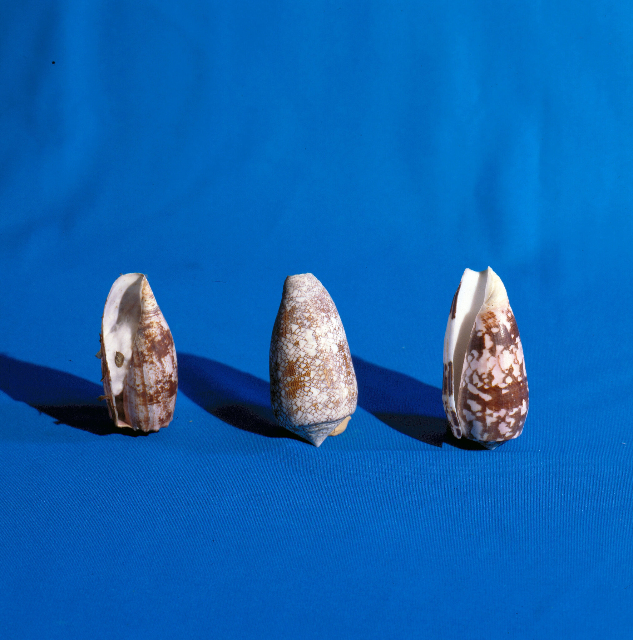 生長在深海一百至五百公尺的芋螺,也是貝類的珍品。它們經常棲息在嶙峋的珊瑚礁縫隙中,不易捕獲,並且常常給珊瑚礁碰傷,完整的芋螺少之又少,價值非常驚人。「像這隻雪花芋螺看起來貌不驚人,但完整無缺,要值數萬元新台幣。