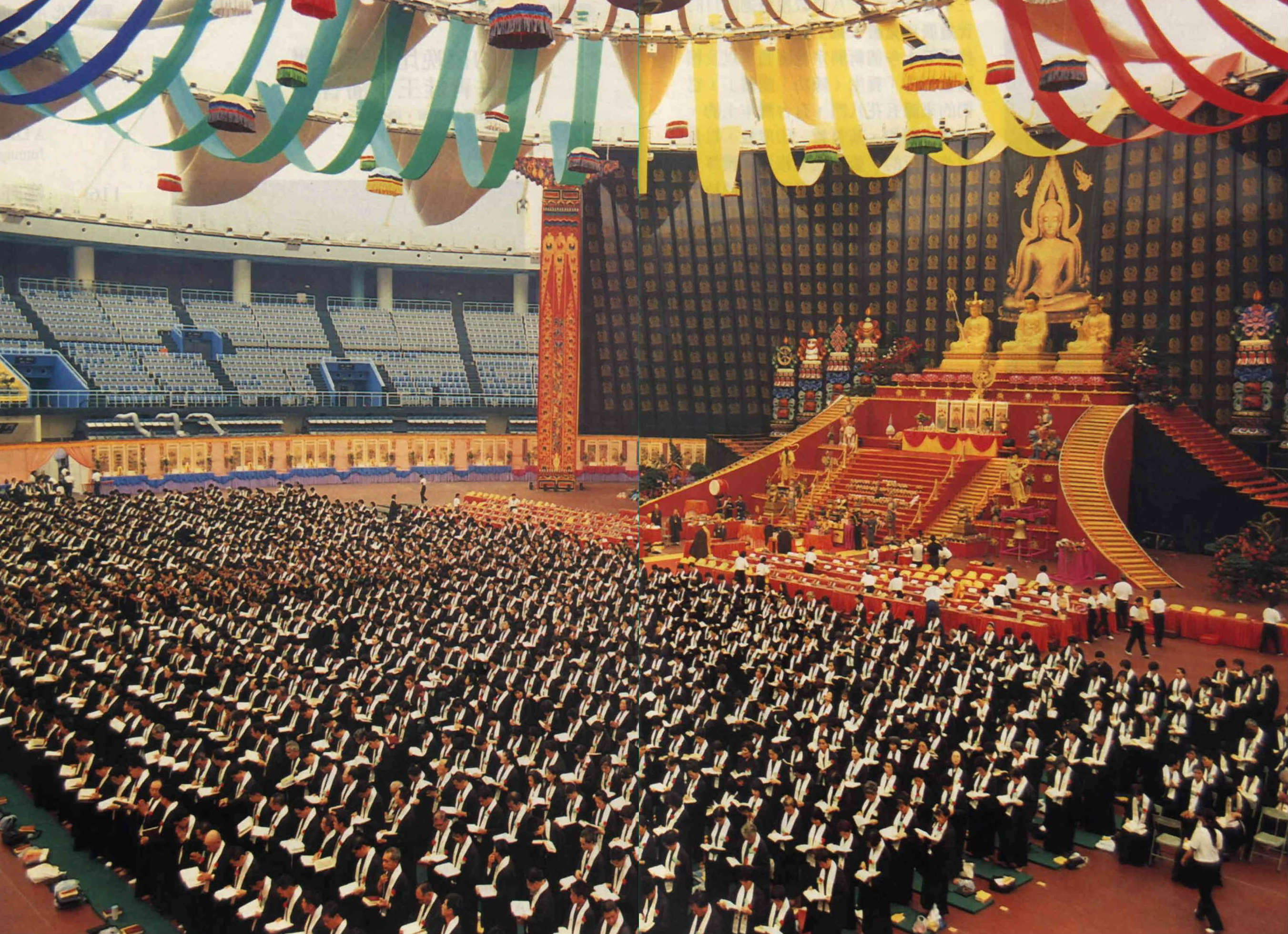 如來佛祖西方三聖在上,瑤池金母居中,而壇城最前端,端坐著以真人塑像、號稱「蓮生活佛」的真佛宗師尊盧勝彥。(林格立)
