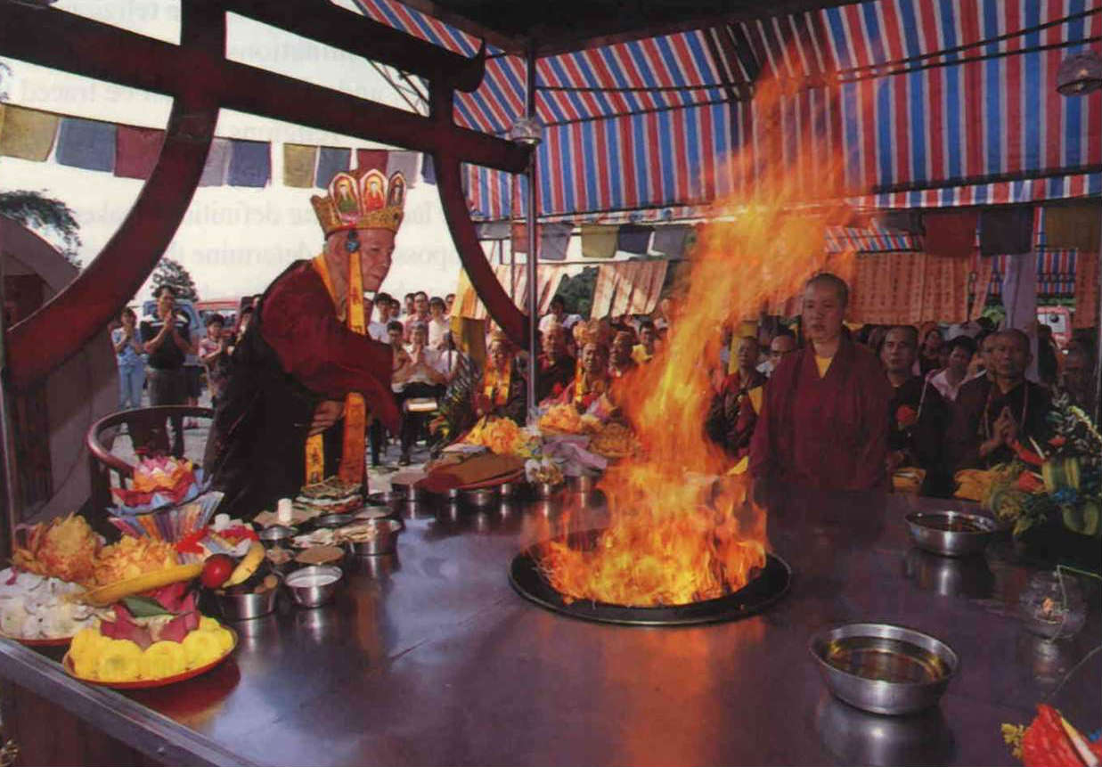 熊熊烈焰中,金剛上師將普渡祭品一一獻祭給冥界眾生,隨即打起令人眼花撩亂的密教大手印。這是真佛宗護摩火供法會一景。(林格立)