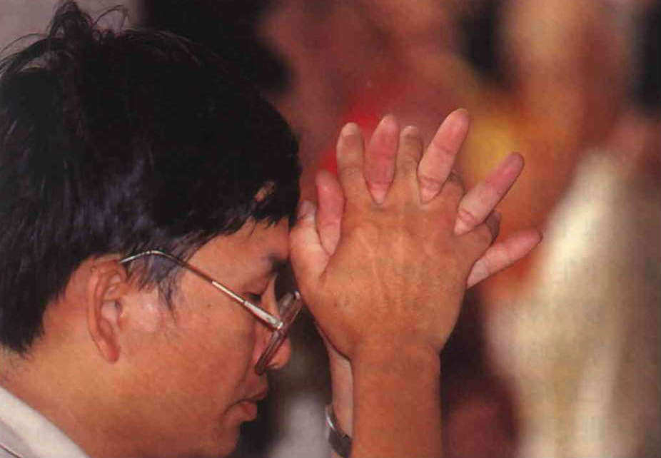 真佛宗法會中,信眾虔誠祝禱。十指交錯的三叉杵手印,祈求的是護法金剛護持。(林格立)