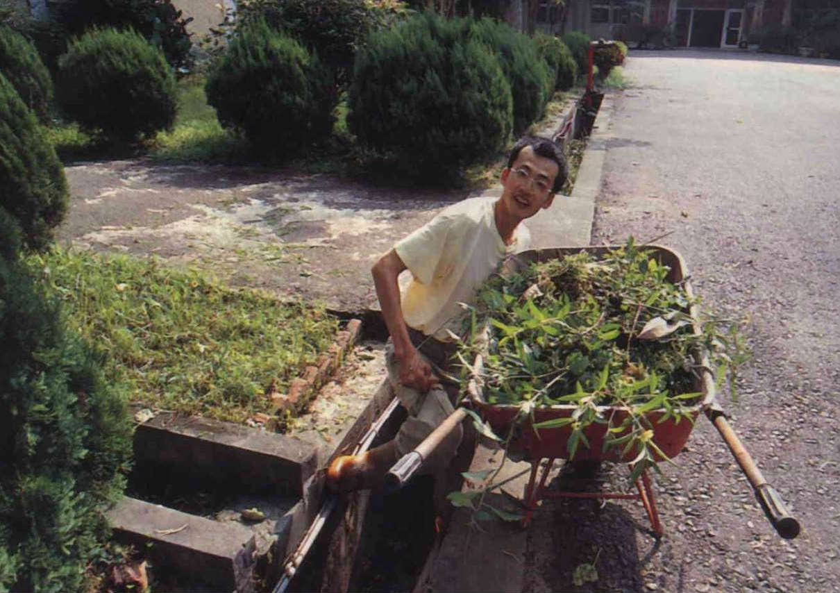 上午九時音樂響起,勞動時間開始!位於南投魚池鄉的天帝教「鐳力阿道場」神職人員們,井然有序地到自己的責任區進行勞動服務。(林格立)