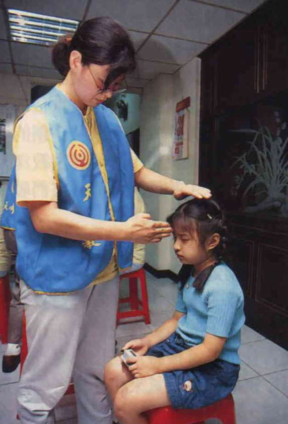 「靈療治病」是新興宗教相當普遍的一種神通表現法。天帝教固定提供免費的「天人*功」,穿著黃衣藍褲「奮鬥服」的天帝教使者們,在潛心誦告廿字真言後將自己化為媒介,接引宇宙的浩然正氣來化除患者的陰濁附體,還不時伸手援引無形的天上金丹注入小紙杯裡,讓患者和水服下。