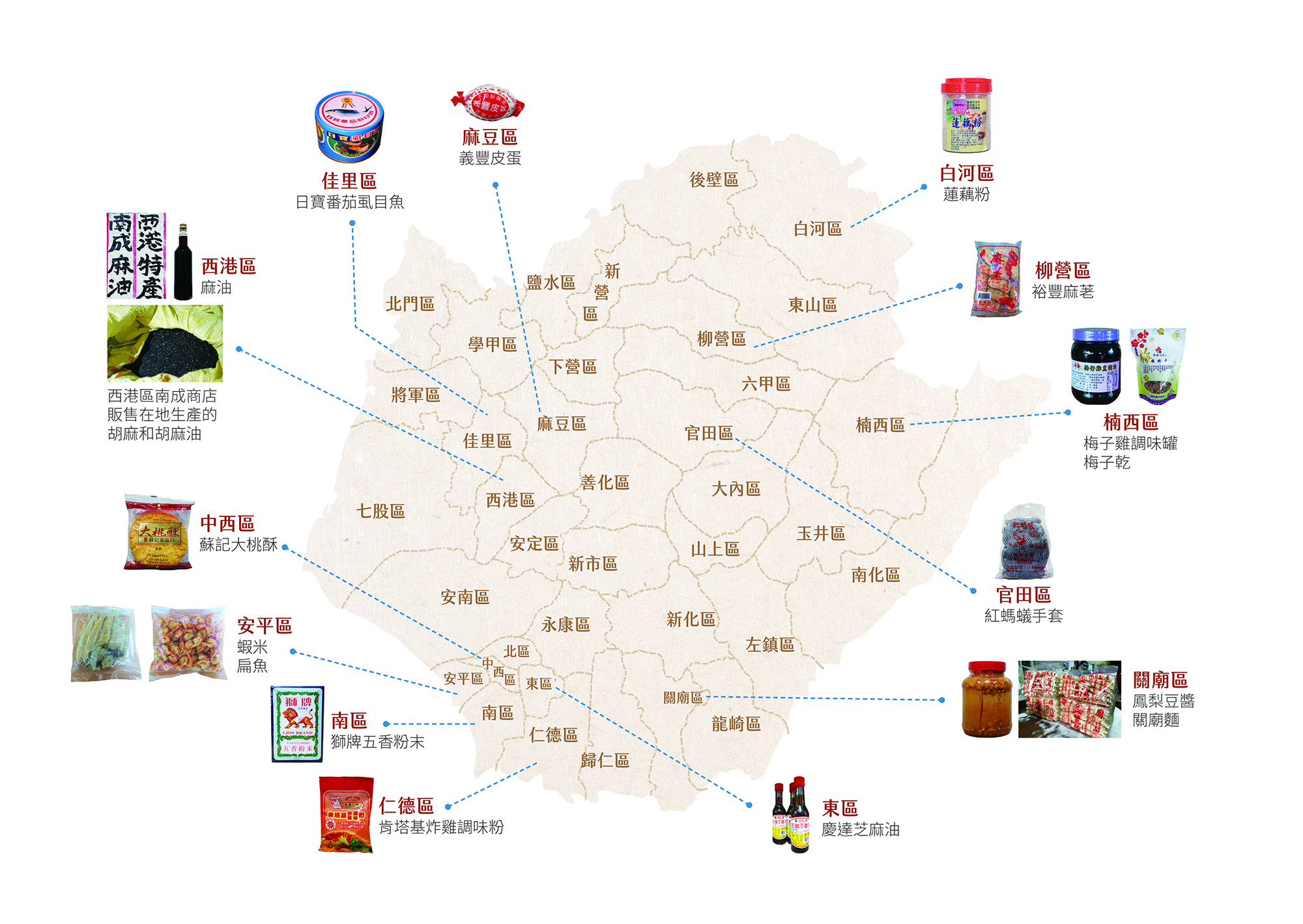 臺南靠海的地區多以漁業、養殖業為生,使得雜貨店也頗有漁村風情:北門店家的冰櫃內擺滿當地養殖、加工的真空包虱目魚,安平的雜貨店則有漁人捕撈後加工的蝦米、扁魚。往山區走,到產梅的楠西區能在雜貨店看見梅子乾、梅子雞調味罐;以蓮花產業出名的白河,許多雜貨店販售蓮藕粉且不少是店家自製;而西港的胡麻產量大、品質好,除直接銷售,亦加工為麻油增加經濟效益,每到十一、十二月的胡麻產季,該區的雜貨店內幾乎都有寄賣或自產自銷的麻油。