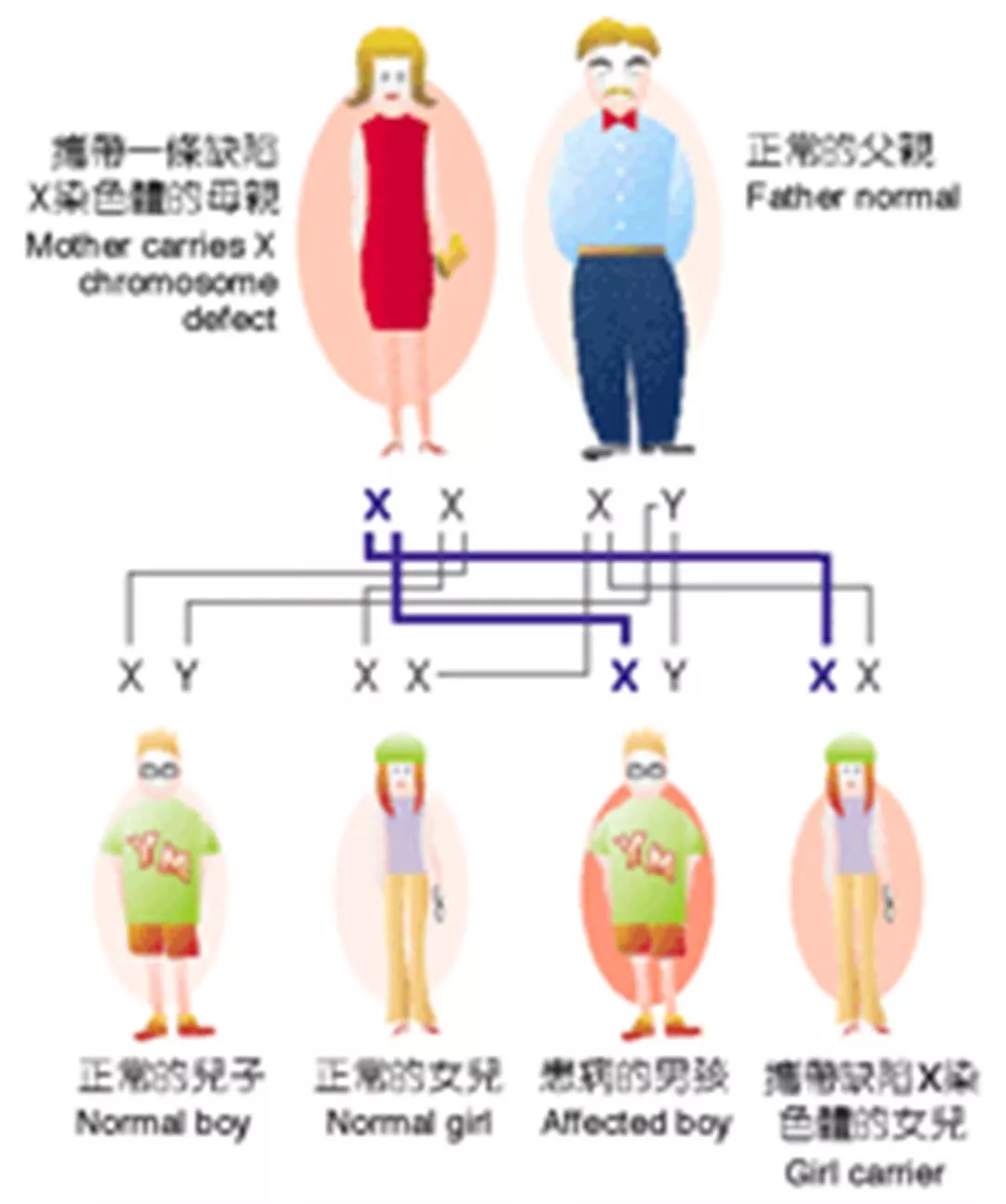 攜帶缺陷X染色體的女兒與X染色體連鎖的遺傳疾病當母親攜帶一條缺陷X染色體、一條正常的X染色體,而父親擁有正常的X及Y染色體時,所生的男孩有二分之一的機率會顯露病徵;女兒亦有二分之一的機率會和母親相同,成為X染色體缺陷的帶因者。