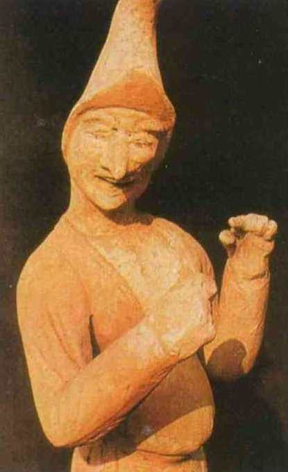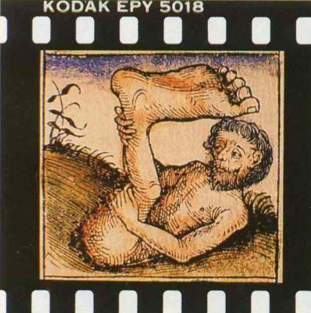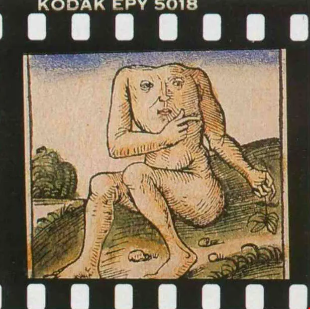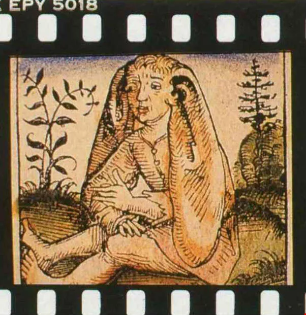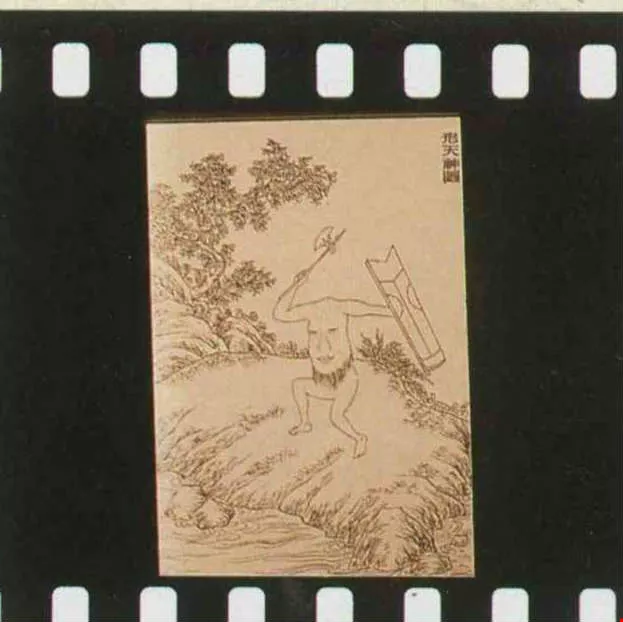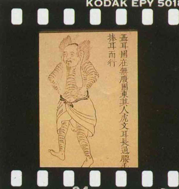 希臘人所設想的東方世界,有大腳先生(圖六)、長耳朵紳士(圖七),還有位老兄的五官四平八穩地生在胸前(圖八)。這真是異想天開?!再看「山海經」裡,聶耳國這位手捧長耳的公子(圖九),河岸邊腰生鬍鬚的形天神(圖十),豈不活像一對孿生兄弟?