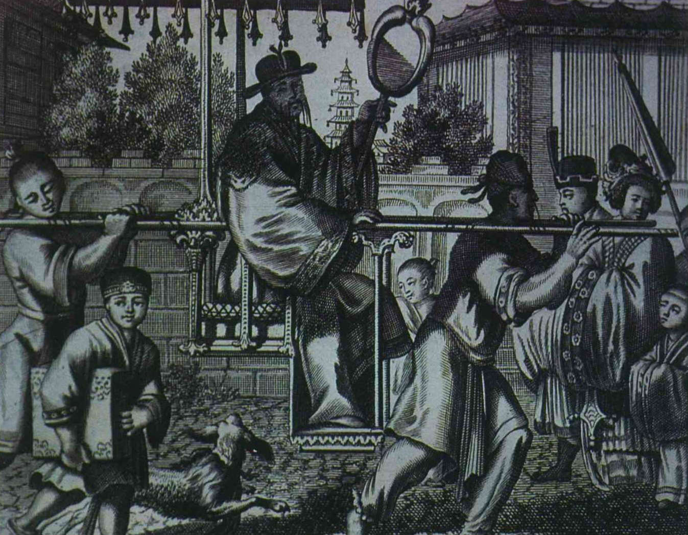 塔、轎子、五綹鬚,常是西方人畫中國時不可或缺的元素。(鄭元慶/萊登漢學院提供)