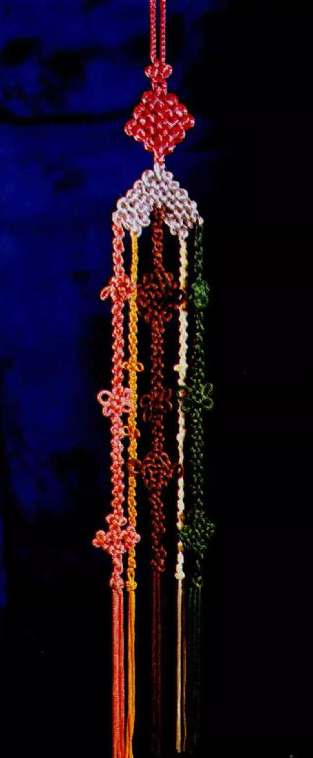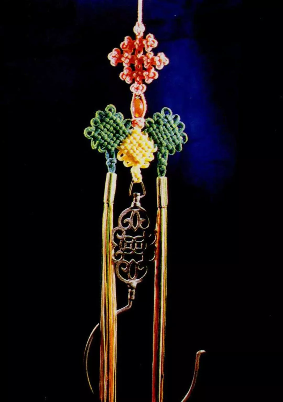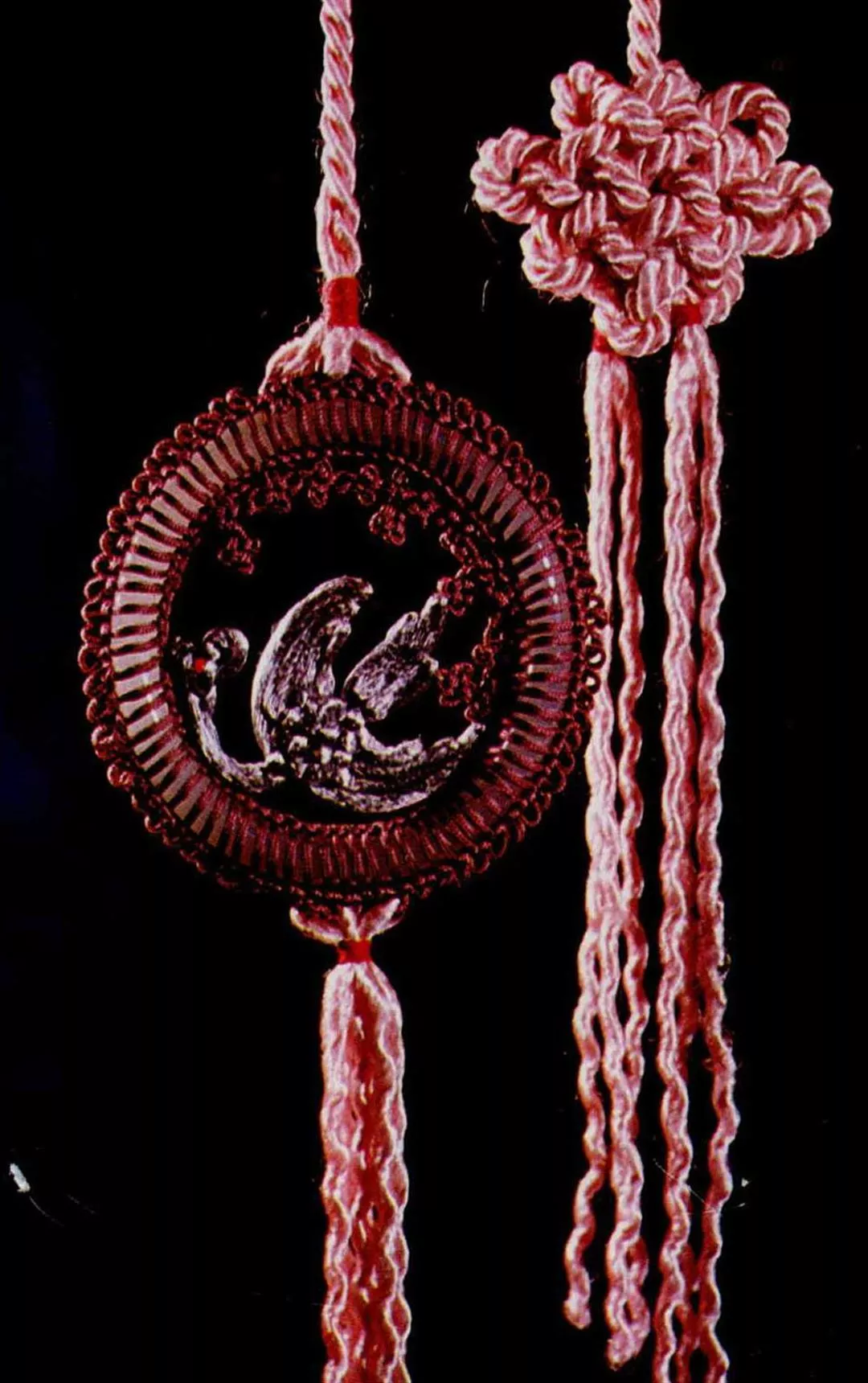 秉承上古「結繩而治」的傳統,中國變化多端的編結技藝,表現在衣服、飾物、盤扣、流蘇……等之上,五顏六色的絲繩,經緯交錯,或構成生動的圖案,或呈現盎然的逸趣,或寓意吉祥,其變化無窮,普遍流行於民間。