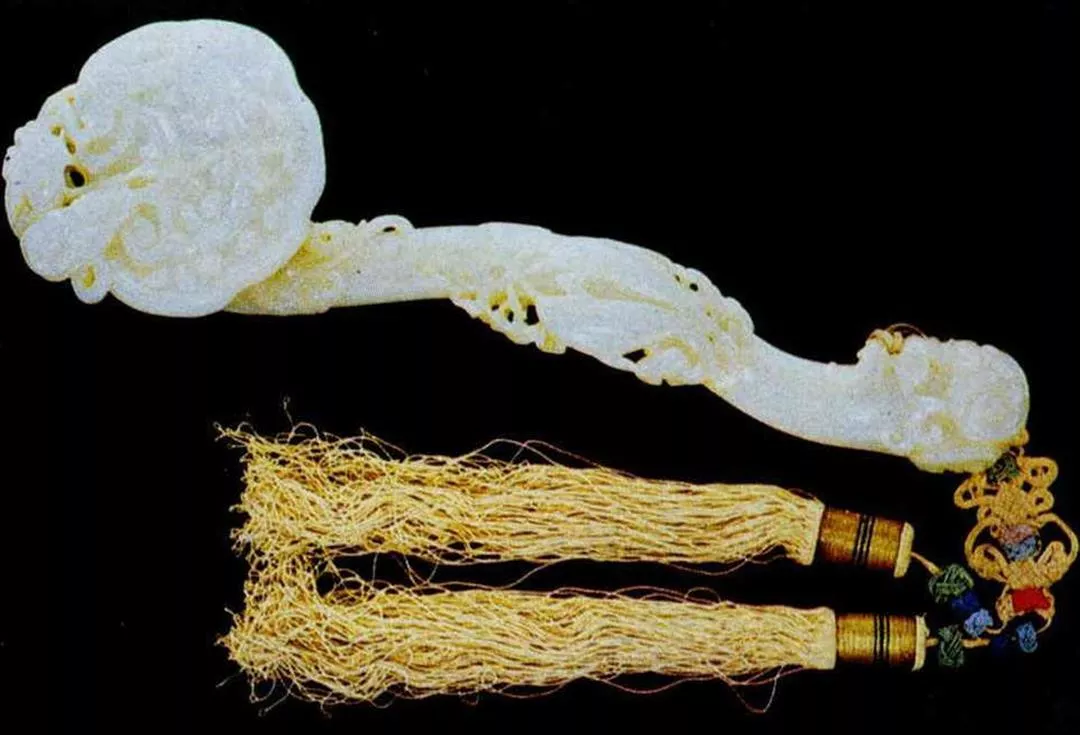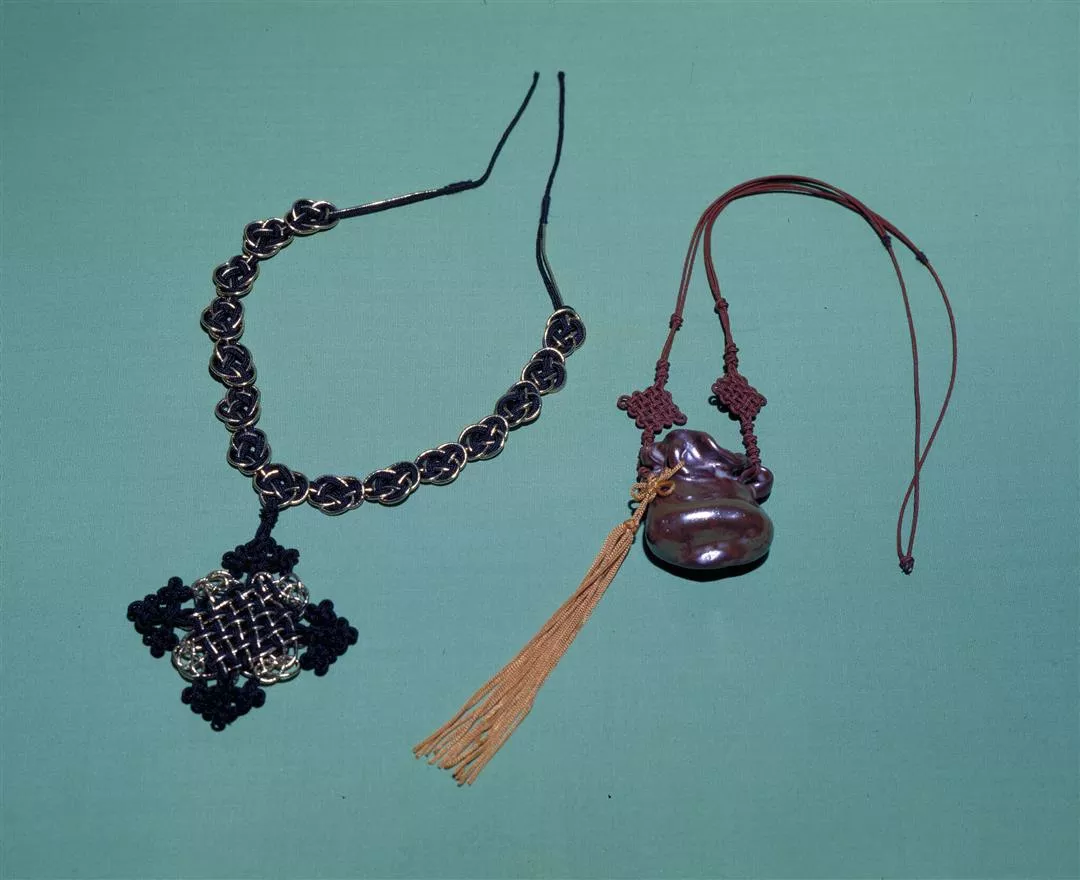 編結適用的範圍極廣,衣服、用品、人身上皆可用到;甚至飾品本身,亦可借重編結予以美化。圖中的小背袋、玉如意即是明顯的例子。