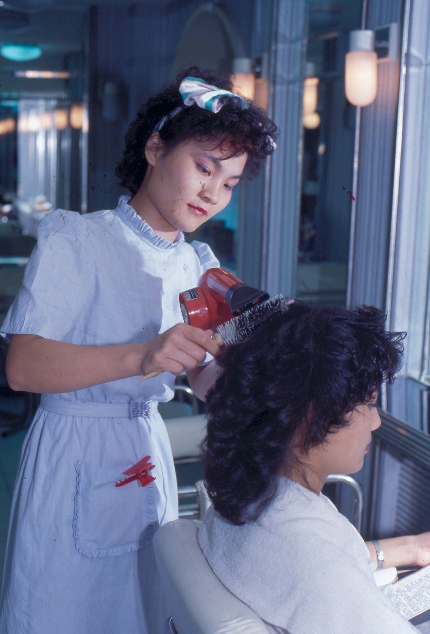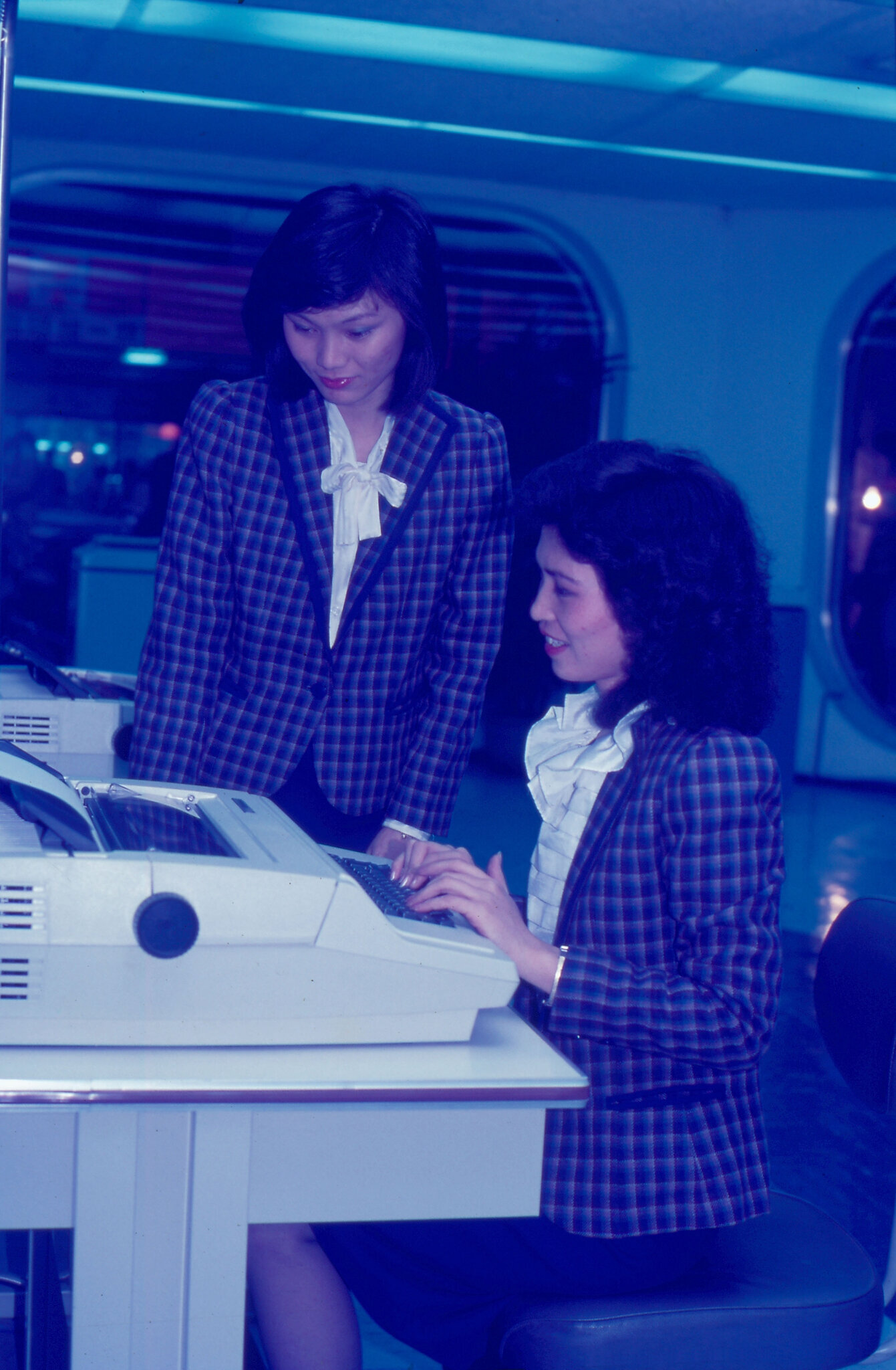 辦公室的男士是藍西裝、斜紋領帶,女士則為藍套裝、蝴蝶領結。電梯小姐、接待小姐等服務員的制服,也是深藍色洋裝,但鑲上白邊,小翻領上繫個白蝴蝶結,加上白手套、圓盤帽。營業員的制服則是深藍小立領外套式上衣,配同色窄裙,上衣綴有雙排金扣,袖口則鑲上兩條金槓,黃良惠說:「這是傳統服務業的象徵,能給人信心和安全感。」
