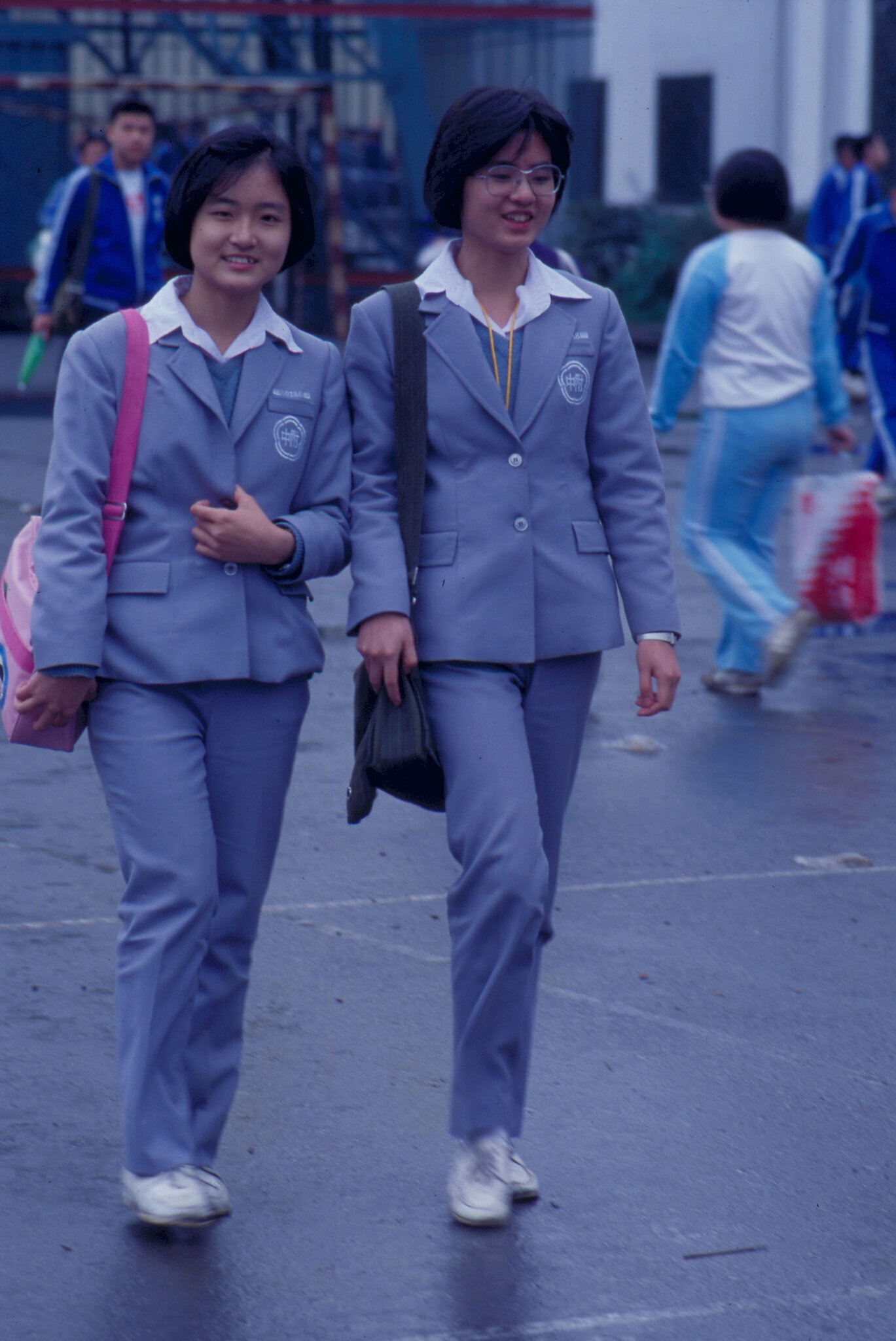 至於高中女生,北一女的綠制服聞名卅年,據說當時是為防空顧慮而設計的,後來成為榮譽的象徵。二女中(中山女中)的白衣黑裙、景美女中的黃衫黑裙,也都有不同的徵別。高中男生的制服則簡單得多,幾乎都是卡其衣褲或白襯衫、卡其褲。