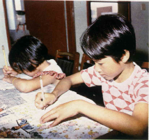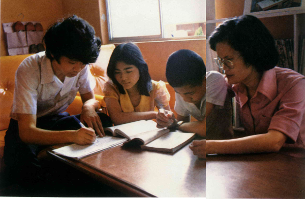 然後,我們進了「謝媽媽」的家。謝媽媽今年卅一歲,實踐家專兒童保育科畢業。謝媽媽的二個最大的孩子和二個最小的孩子都在家,二個大孩子今年國中畢業,正在準備參加高中聯考,有一位附近中央大學數學系的大哥哥義務地來給他倆補習。中央大學的許多學生,都常常到兒童村來熱心地給孩子們指導功課,他們有時也帶孩子們出去郊遊、寫生或釣魚。由於他們的愛心,分擔了不少「媽媽」們的辛勞。