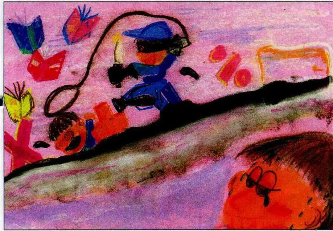 為此,本刊特別與北市民族國小五年級美勞資優班合作,以「我覺得最有壓力的事」為題,請全班卅位小朋友自由創作。結果排名第一的壓力源是考試(十一位),其次是不只一樣壓力源的綜合畫面(三位),此外為怕鬼怪、勒索綁票、被車子撞到、被動物追咬、怕環境生態被破壞(以上各兩位),以及怕爸爸打人、父母吵架、世界大戰、看牙醫、失明、自己(以上各一位)。