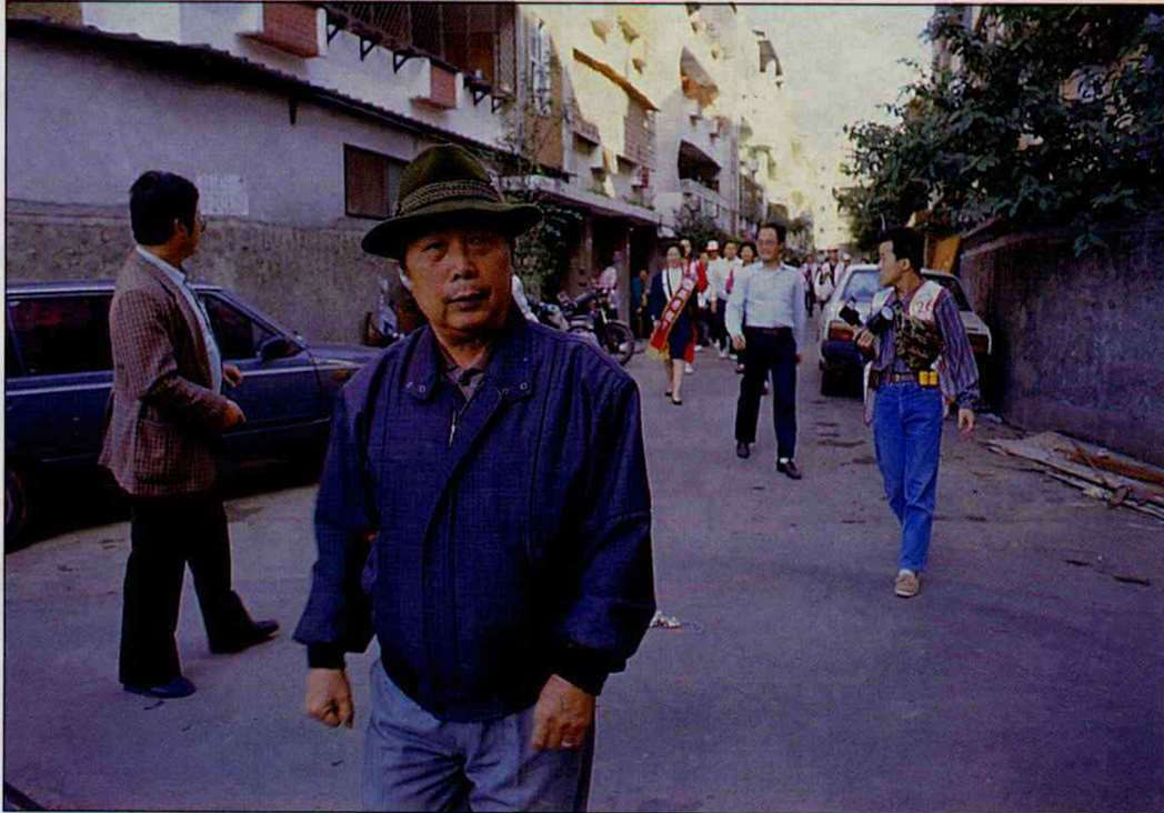 候選人沿街拜訪選民俗稱「掃街」,通常由里長領軍,一位候選人在選戰期間每天要「掃」的街道比專職清道夫還多。(卜華志)