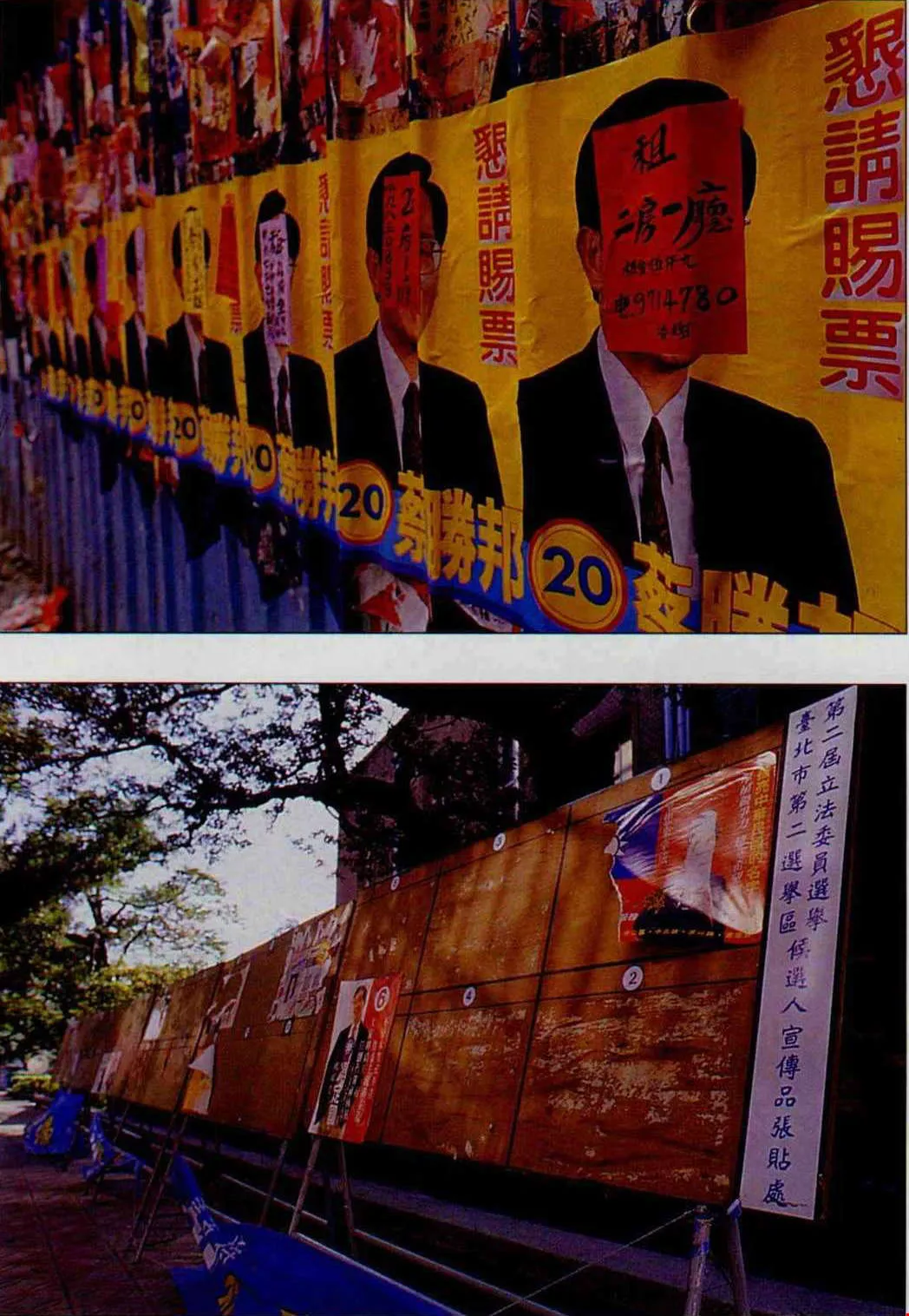 候選人文宣不愛貼在公設看板的小框框裏,與其他廣告爭寵,又常惹人嫌。(卜華志)