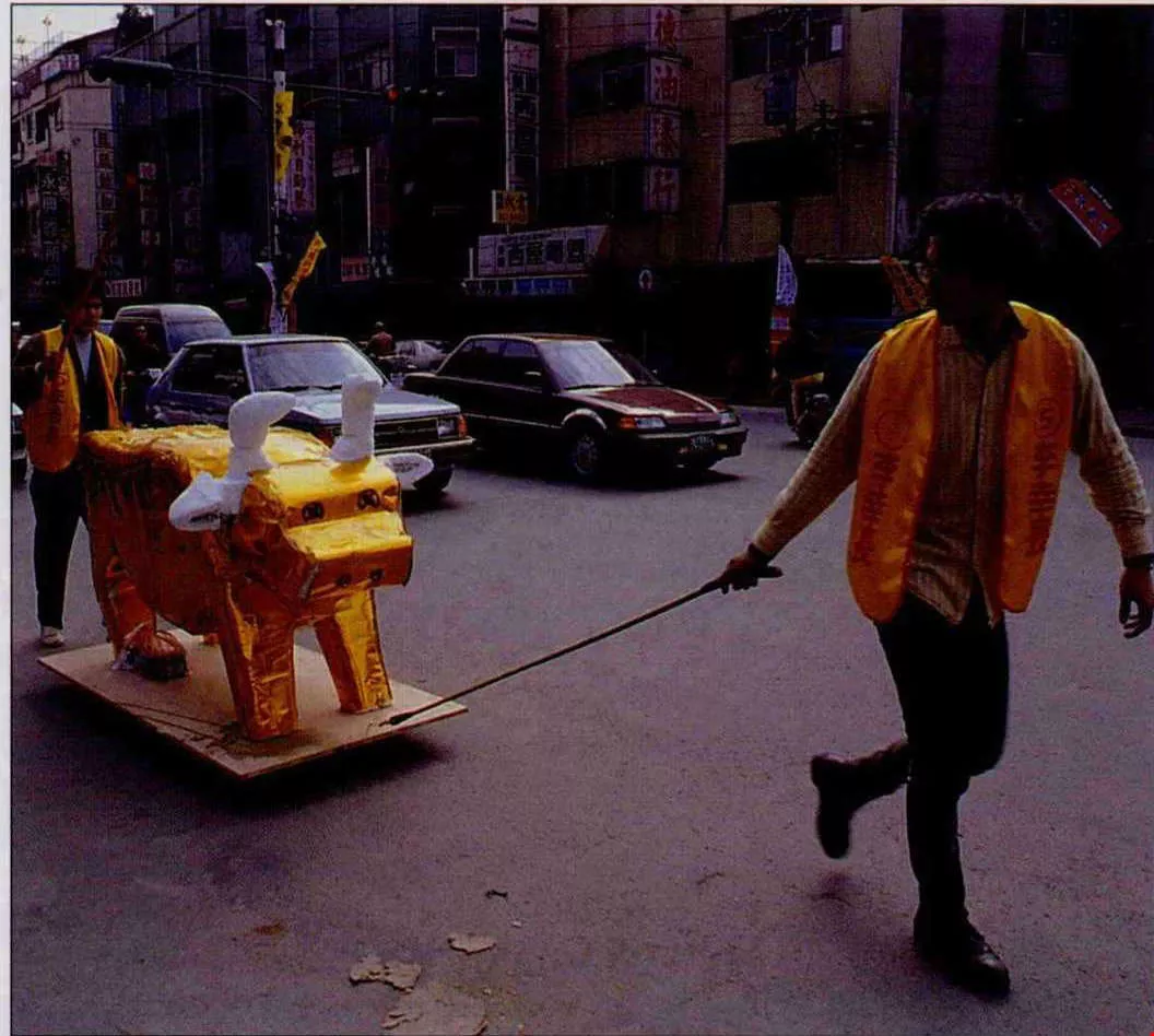 金牛、賄選是選民的最惡,一條「金牛」被拖著沿街痛打,呼籲選民反對金權政治。(卜華志)