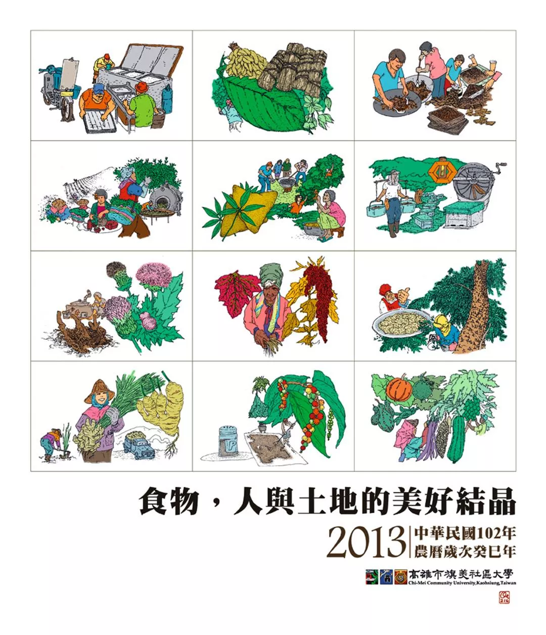 2013年月曆主題「食物、人與土地的美好結晶」,找尋在旗山、美濃等9個區域的紅藜、雞腳刺等特色食物,詳細說明生長耕作,到加工製成食品的在地故事。