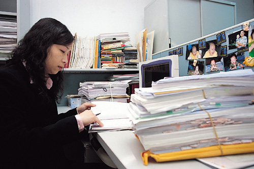 相反地,三樓檢察官專用的辦公室裡就安靜許多。台北地檢署規模屬全國第一,共有一百多名檢察官,每4到5位檢察官共用一間不算寬敞的房間,擠在簡陋隔板隔出的辦公桌上埋頭工作。每位檢察官的手上幾乎都有一百多件正在審理中的案子,新案,狹小的辦公環境裡,只放得下兩、三個鐵櫃,而單一案件的資料,可能就塞滿了一整層的大抽屜。